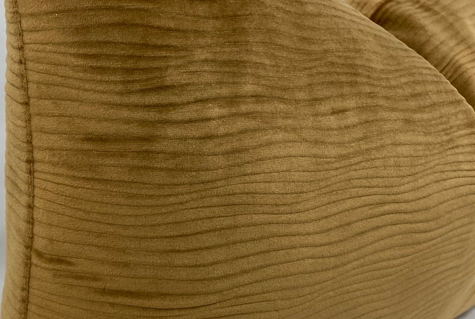 This pillow is 24" x 14" when measured flat with no filling. With filling it is 6" deep. It contains feather and down filling and is made in America. Caramel solid with a wavy pattern in the soft fabric.