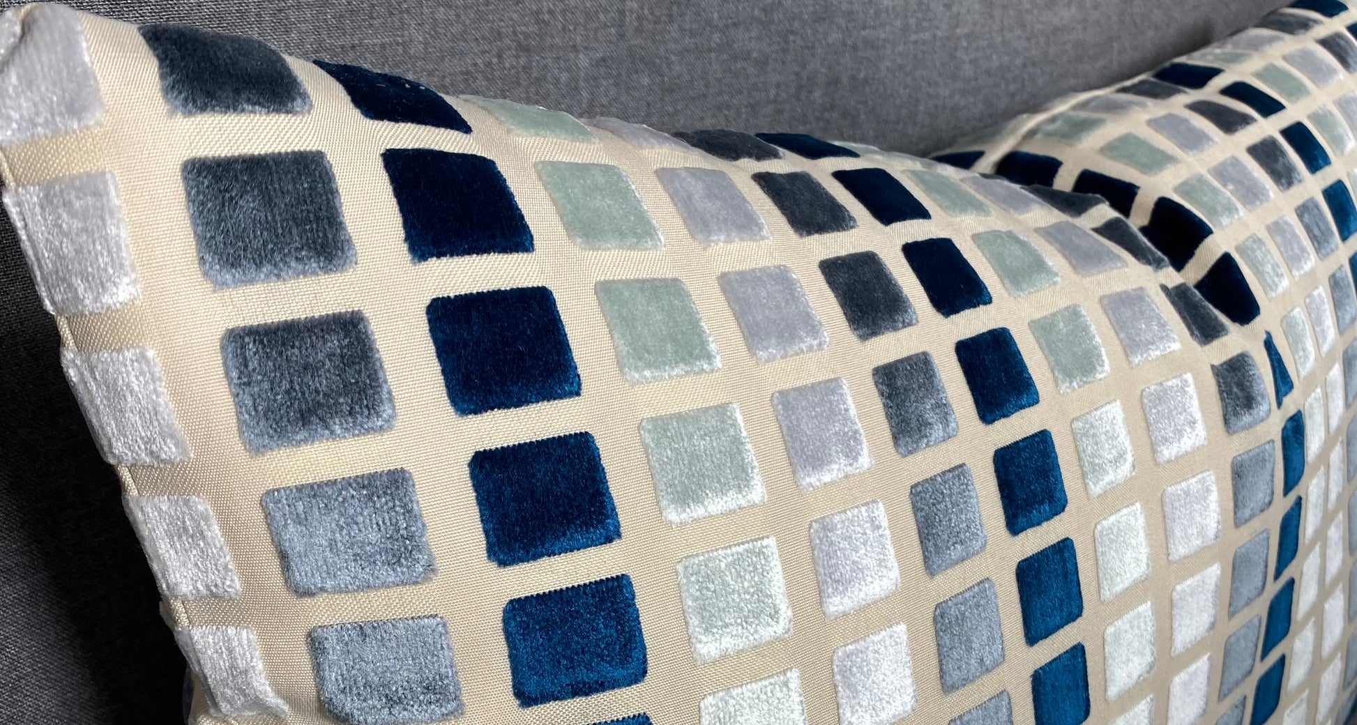 This pillow is 24" x 14" when measured flat with no filling. With filling it is 6" deep. It contains feather and down filling, and is made in America. Blue, gray and white squares over a cream background.