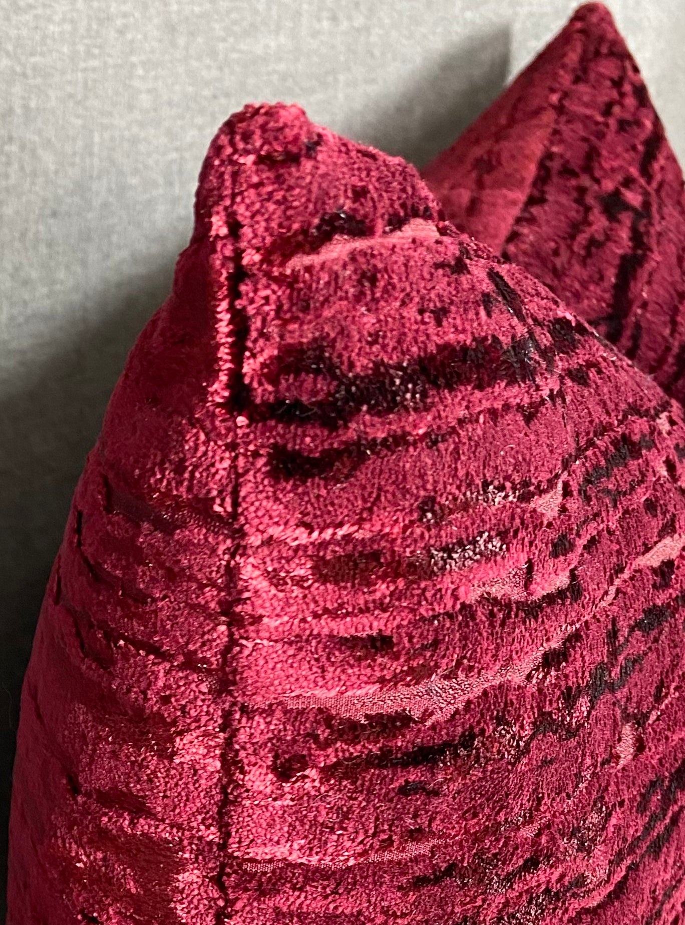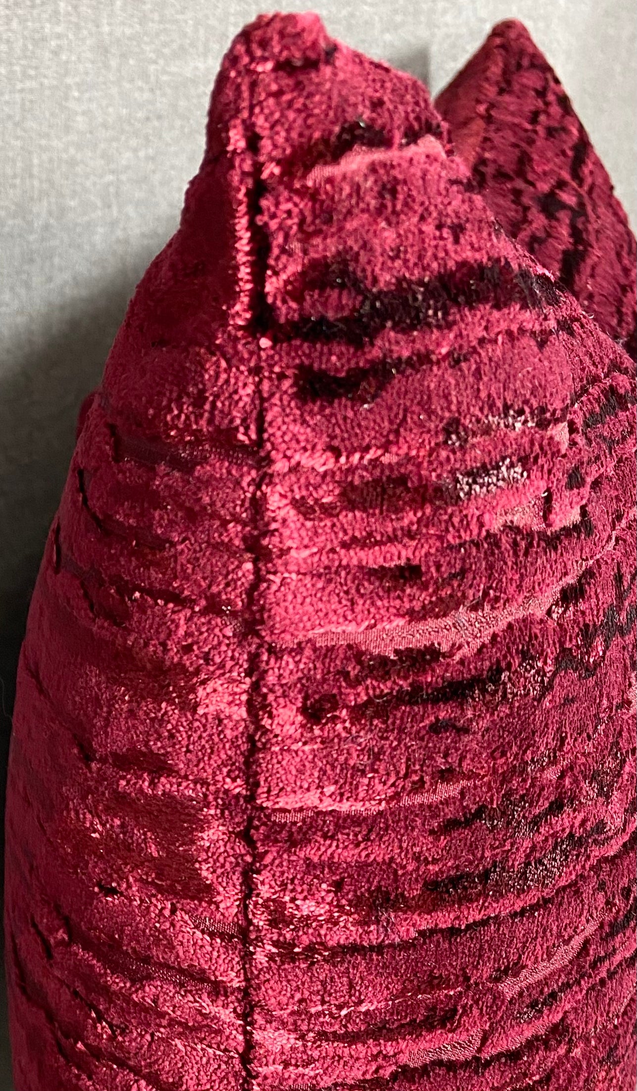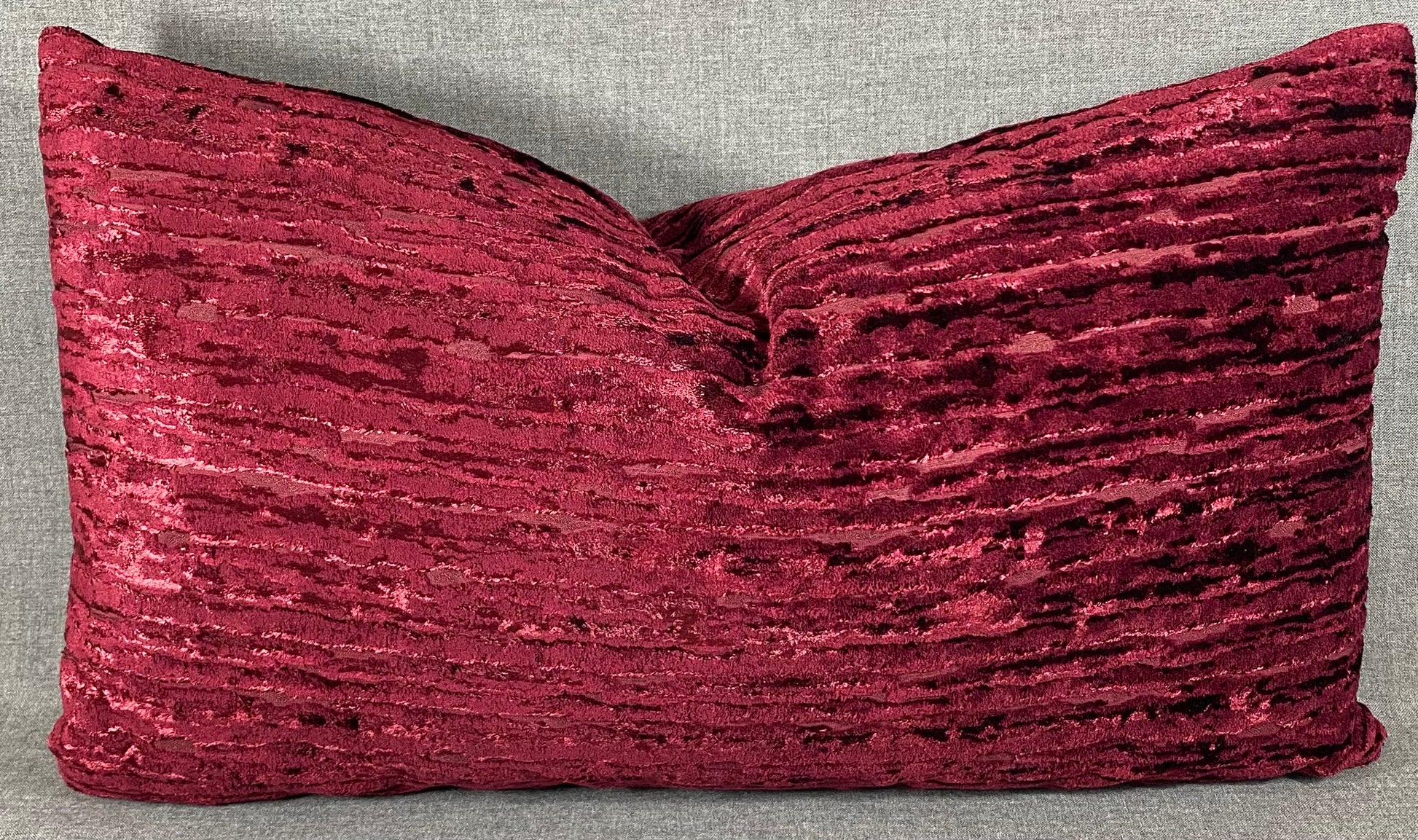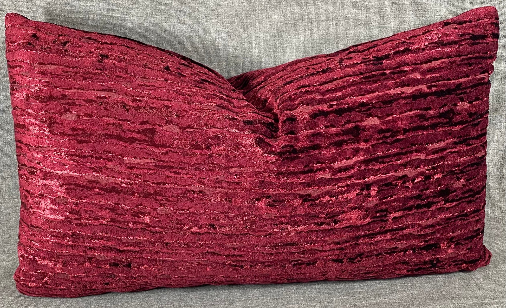This pillow is 24" x 14" when measured flat with no filling. With filling it is 6" deep. It contains feather and down filling and is made in America. A very soft fabric of deep wine red, catching the light to give depth to the color.