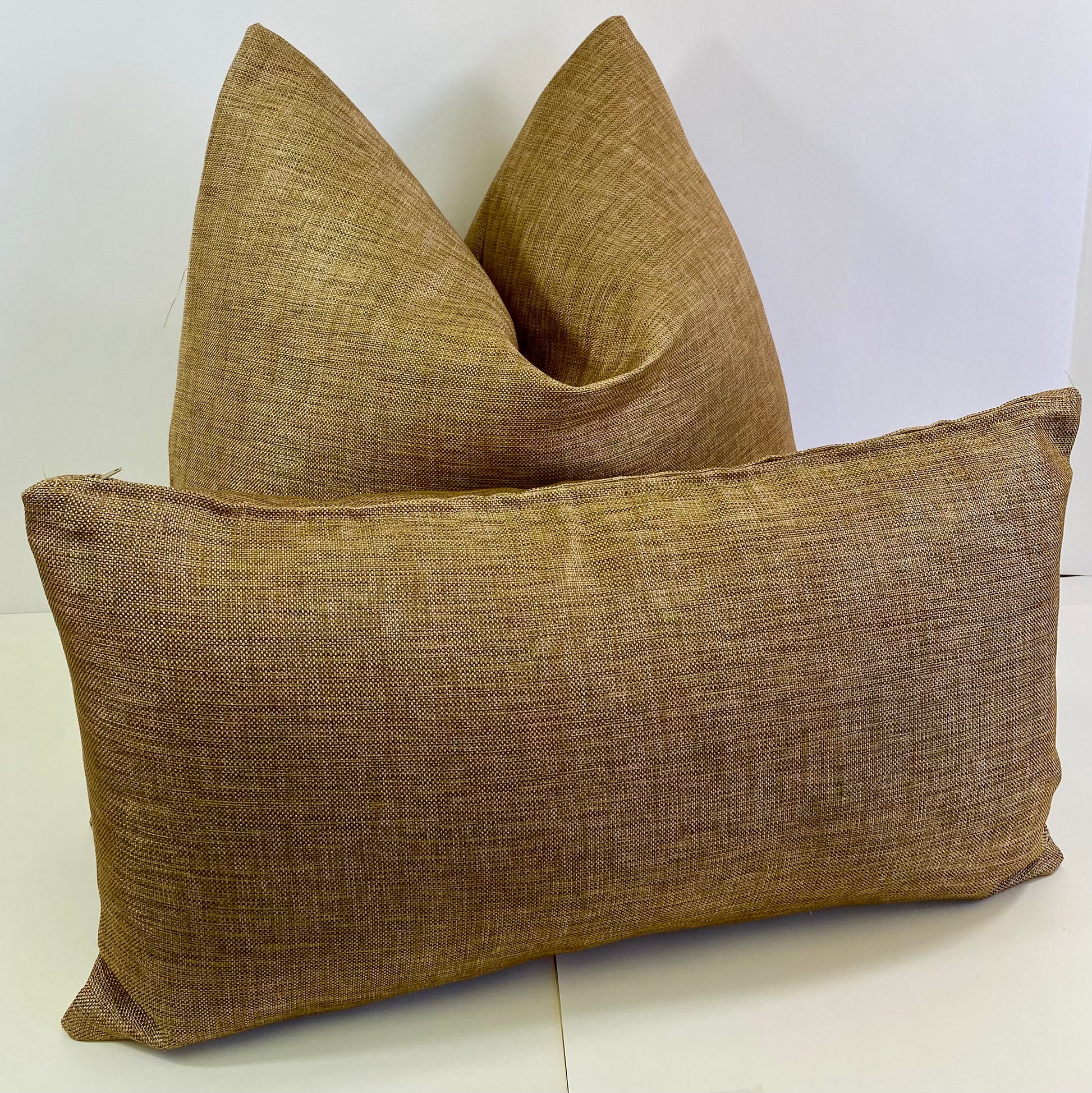 This pillow is 24' x 14" when measured flat with no filling. With filling it is 6" deep. It contains feather and down filling and is made in America. Textured pillow in a shade of a wood brown