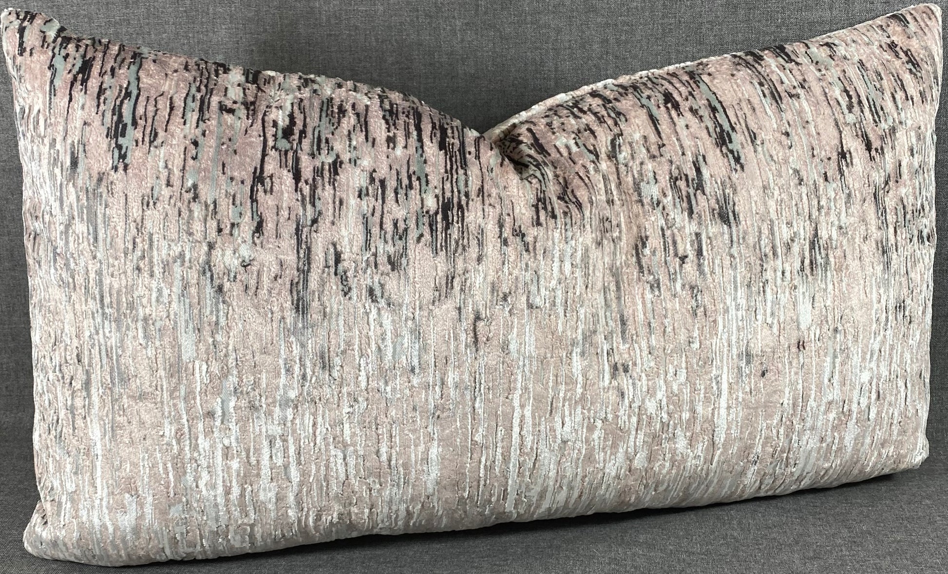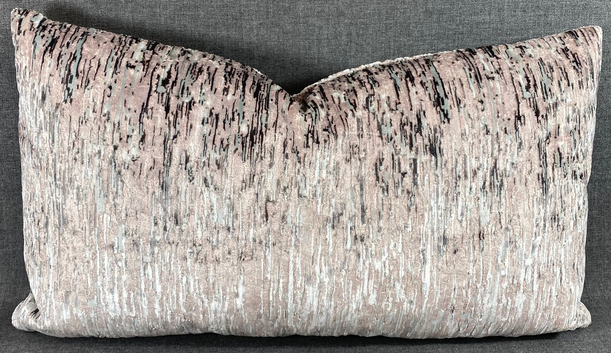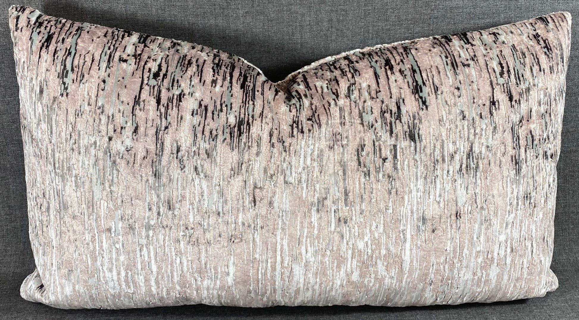 This pillow is 24" x 14" when measured flat with no filling. With filling it is 6" deep. It contains feather and down filling and is made in America. A rain of blush pink and whites run down the pillow front and back.
