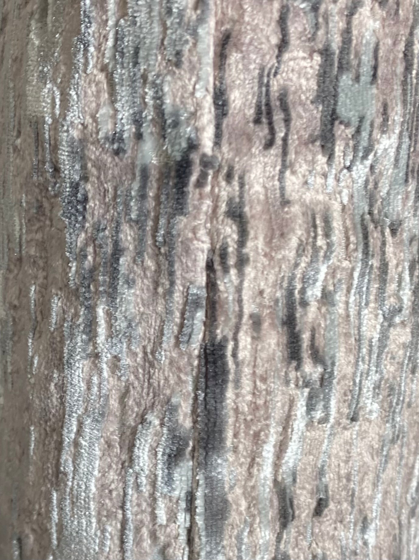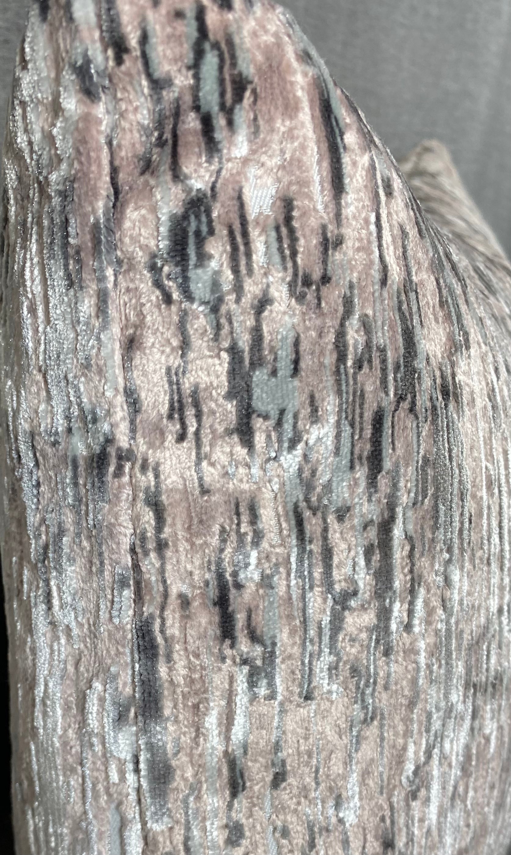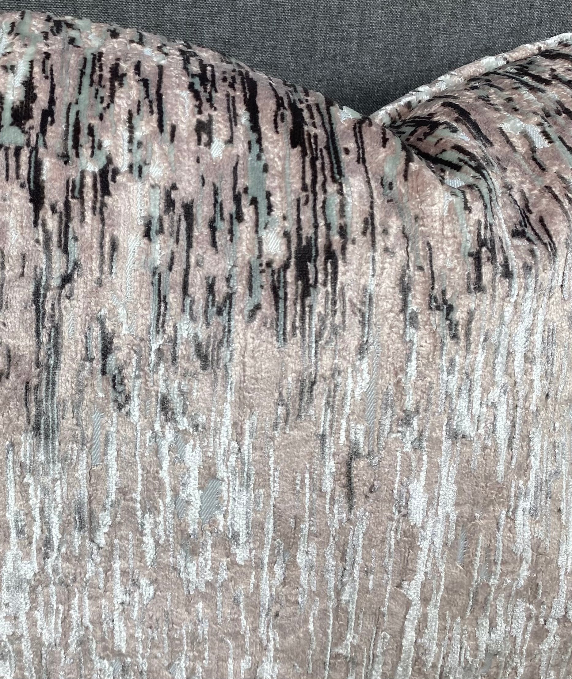 This pillow is 24" x 14" when measured flat with no filling. With filling it is 6" deep. It contains feather and down filling and is made in America. A rain of blush pink and whites run down the pillow front and back.