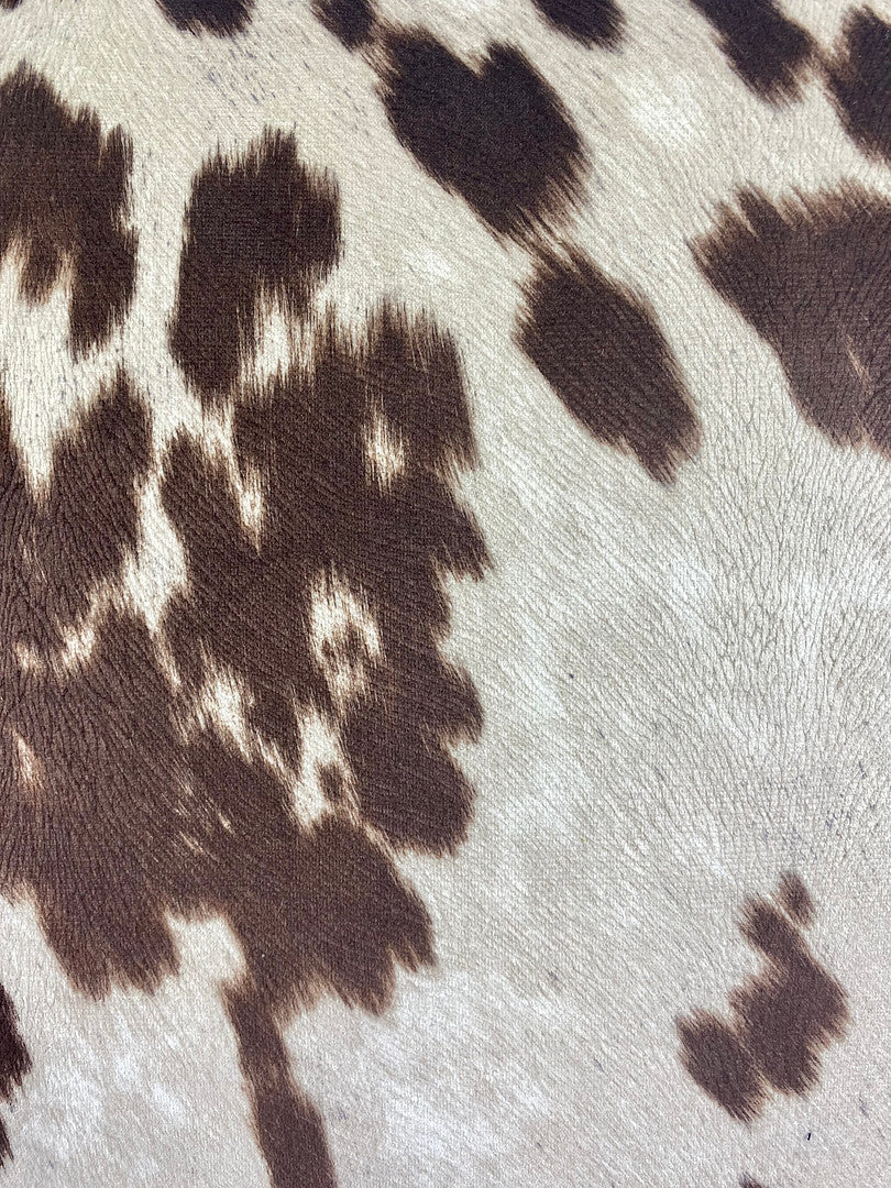 Limited edition. The pillow is 24" x 14" when measured flat with no filling. With filling it is 6" deep. It contains feather and down filling, and is made in America. Brown; Realistic cow hide print on a soft base cloth