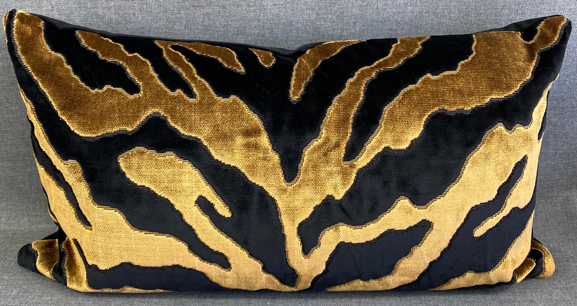 An earthy / tribal vibe that works well with other patterns, black, rust and deep mushroom colors. This pillow is 24" x 14" when measured flat with no filling. With filling it is 6" deep. It contains feather and down filling and is made in America. Chenille stripes of taupe, brown, black & gold on a cream background