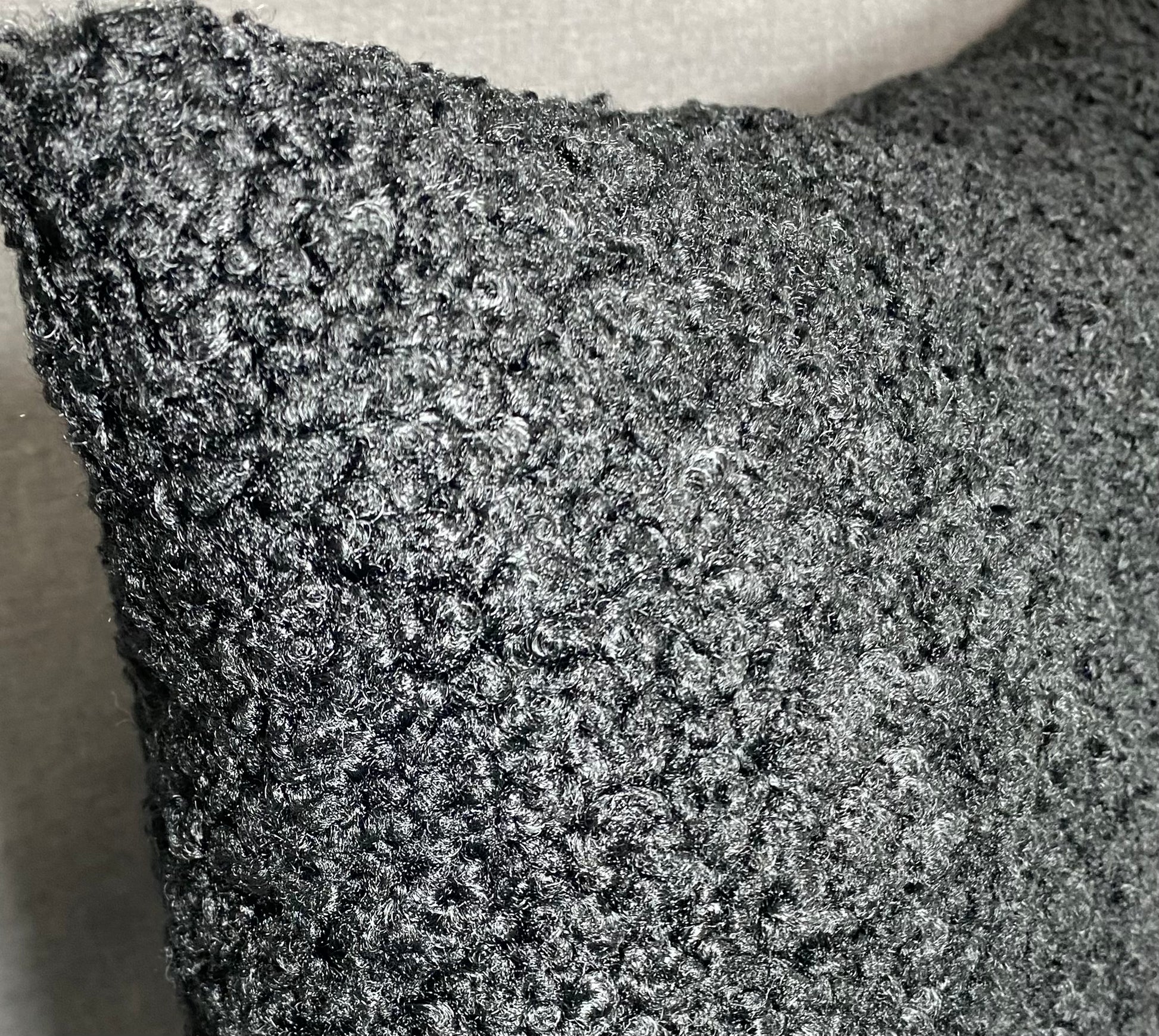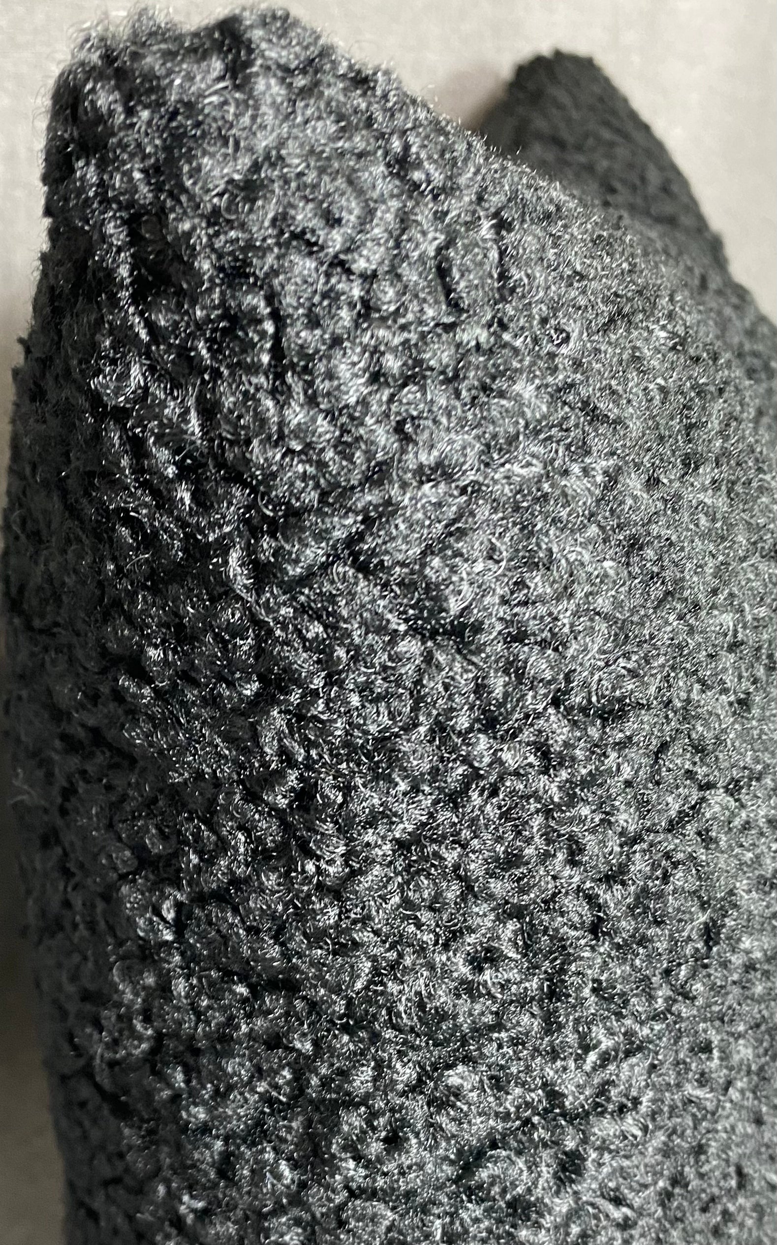 This pillow is 24" x 14" when measured flat with no filling. With filling it is 6" deep. It contains feather and down filling and is made in America. Black poodle like fur.