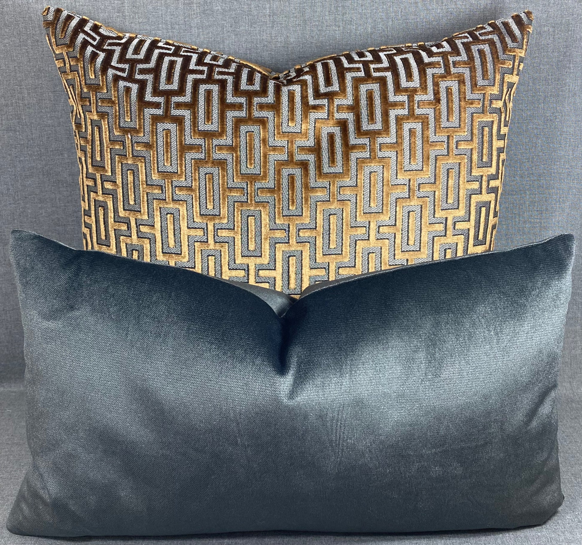 This pillow is 24" x 24" when measured flat with no filling. With filling it is 6" deep. It contains feather and down filling and is made in America. These are limited production runs until the fabric is gone. Charcoal and copper geometric pattern on textured fabric.