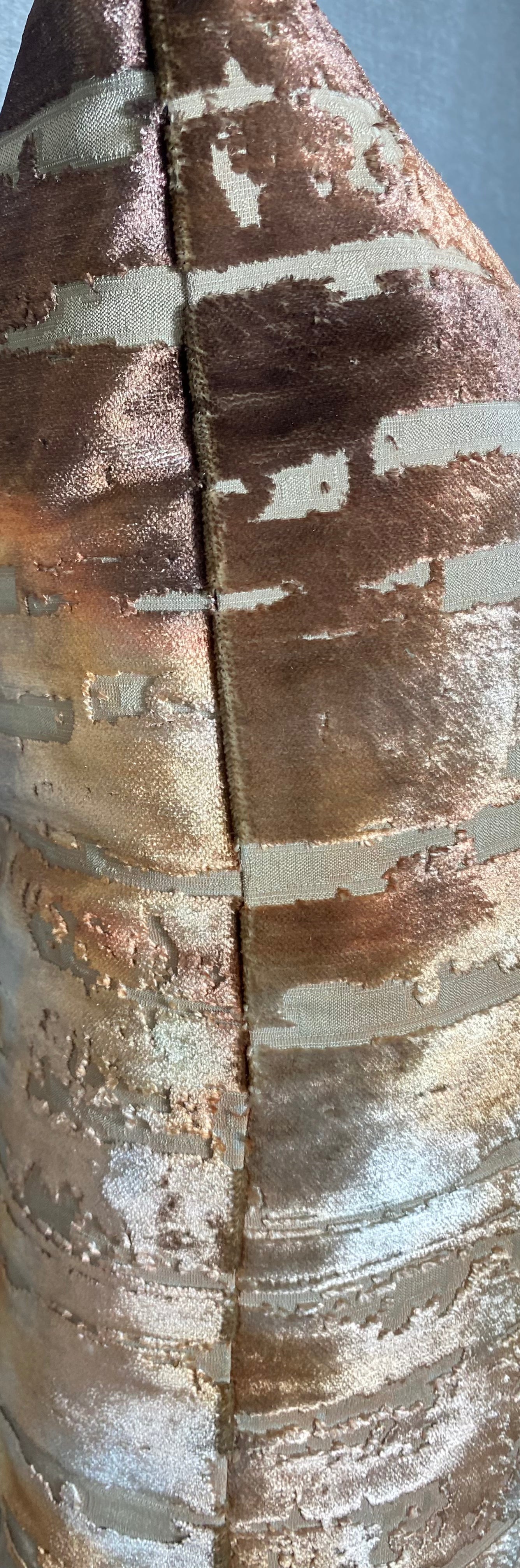 Lush is the only word one can use for this fabric. Think deep brown thick leather modern sofa, brass and timber coffee table and you're in the zone for where this pillow takes center stage.Can also be a sexy add on to a bedroom. It's a best seller. This pillow is 24" x 24" when measured flat with no filling. With filling it is 6" deep. It contains feather and down filling and is made in America.