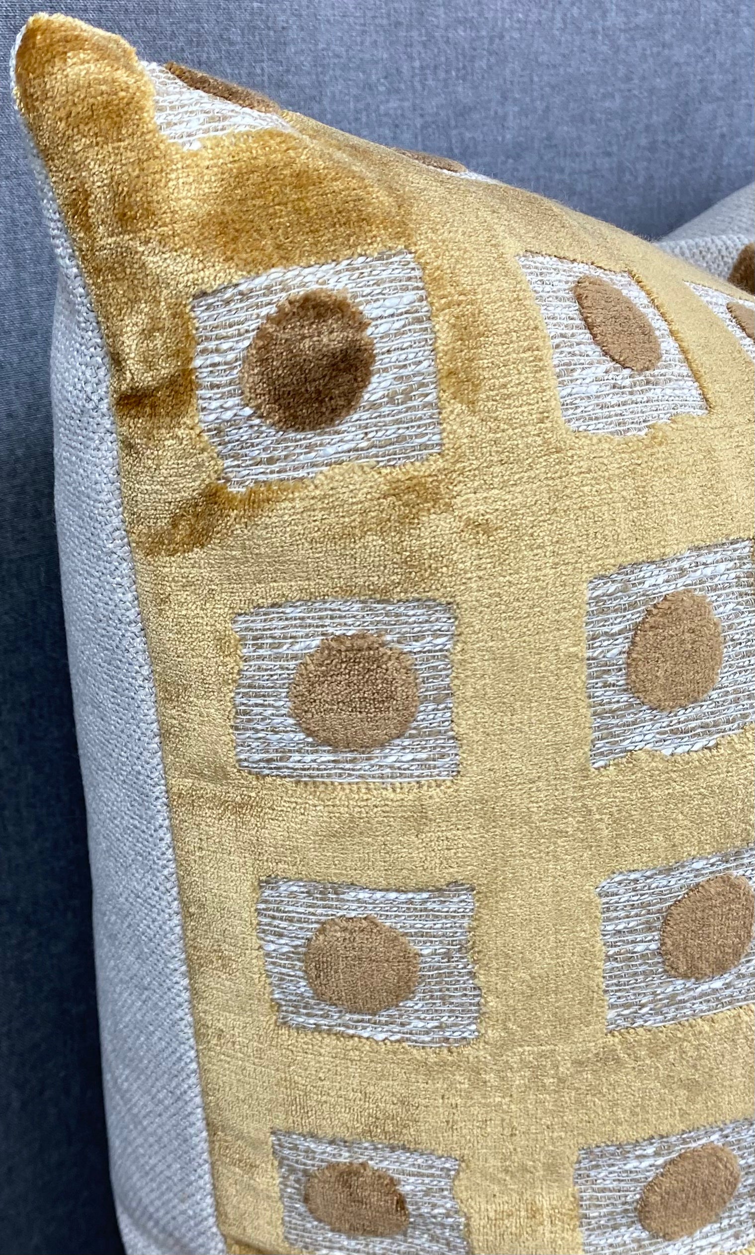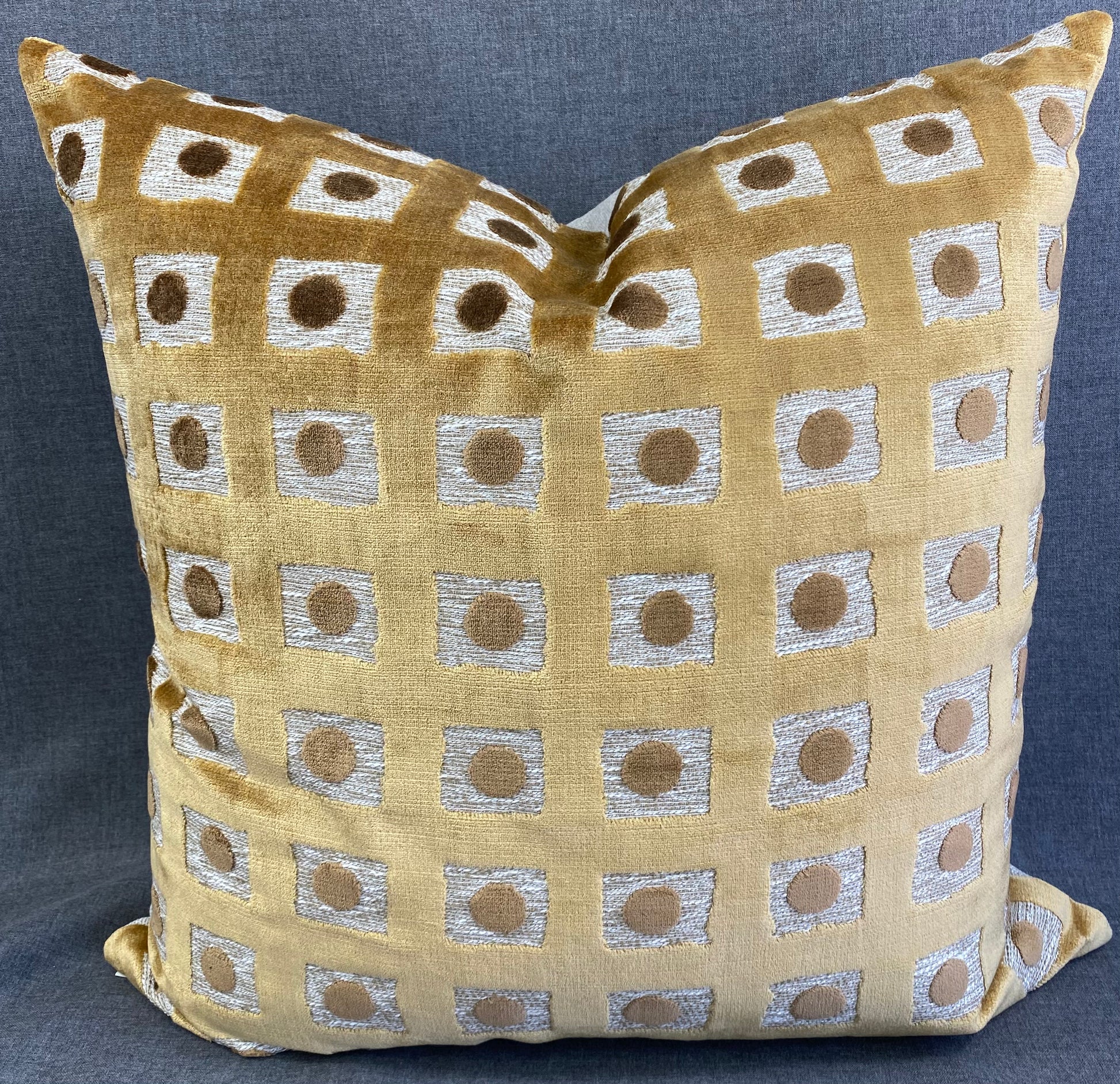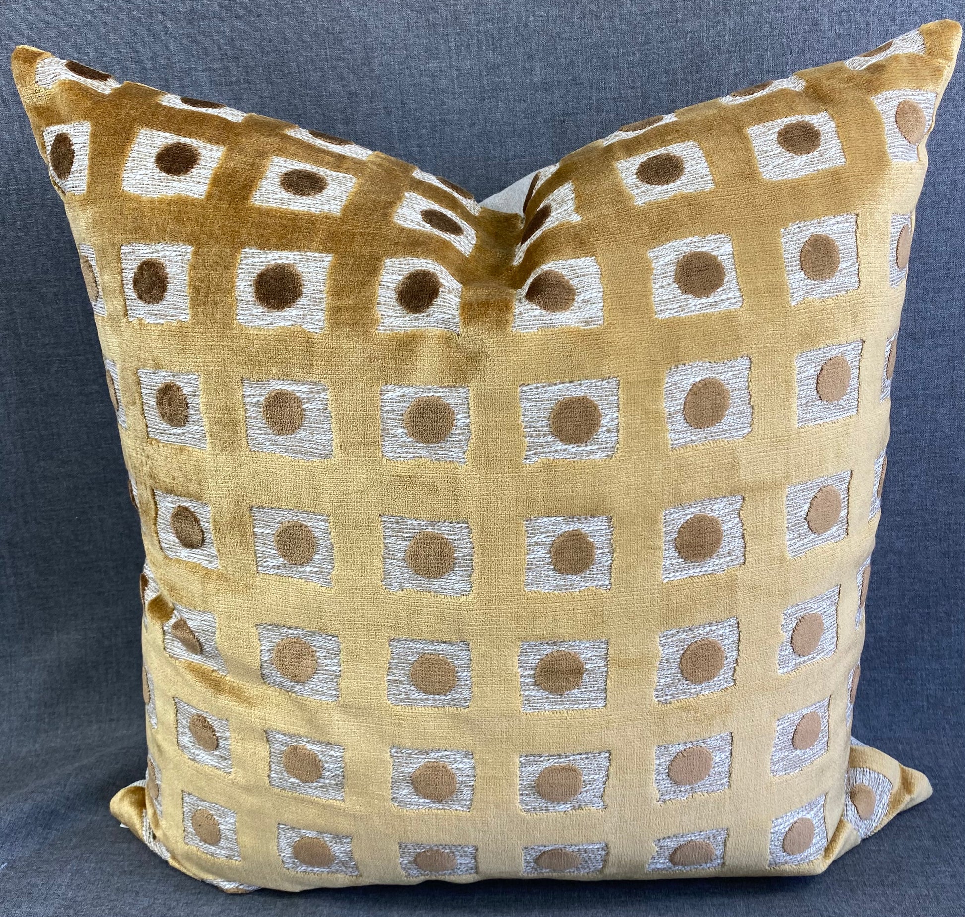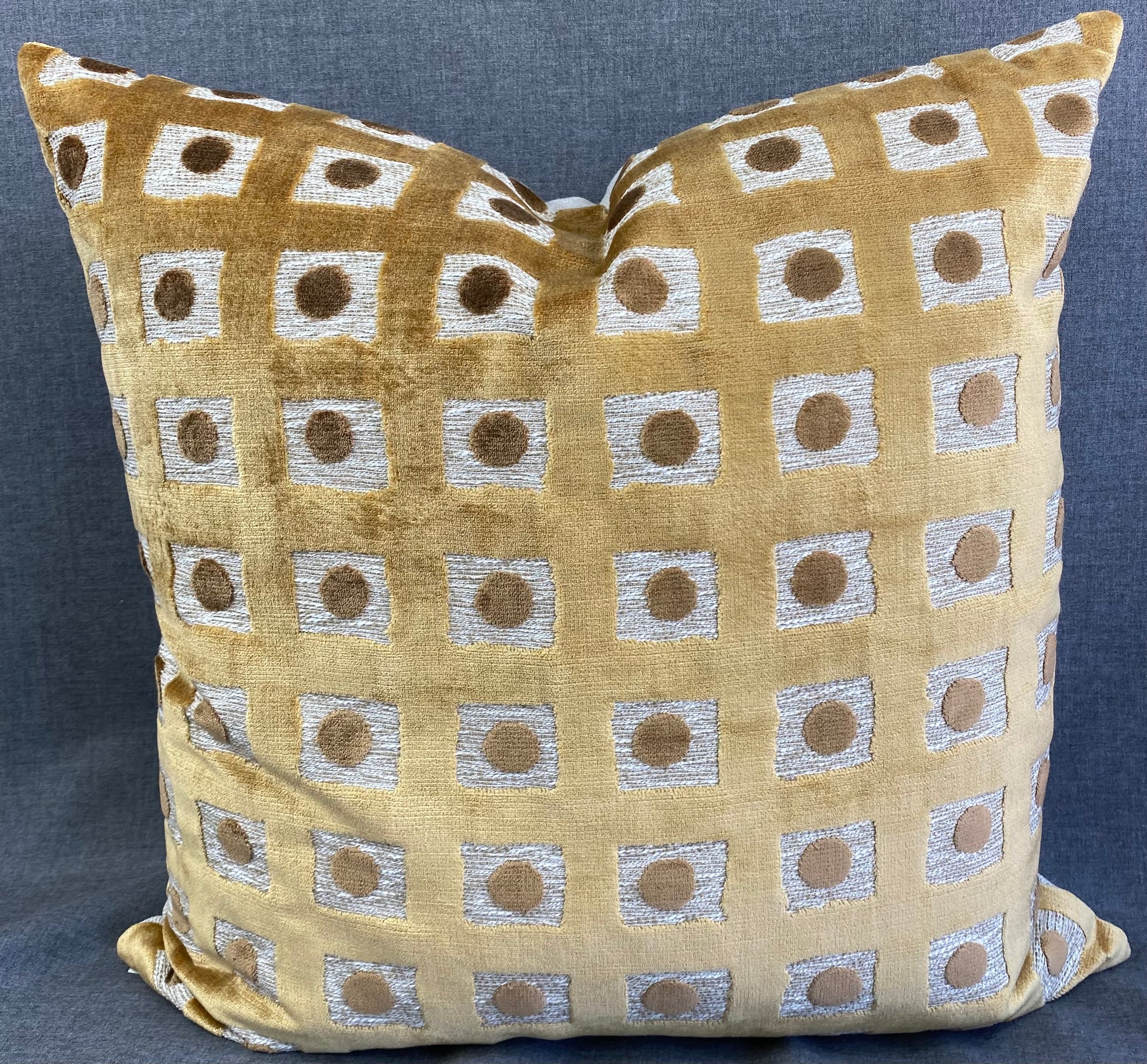 This pillow is 24" x 24" when measured flat with no filling. With filling it is 6" deep. It contains feather and down filling and is made in America. Gold plush raised fabric in circular and square shapes on an oatmeal background