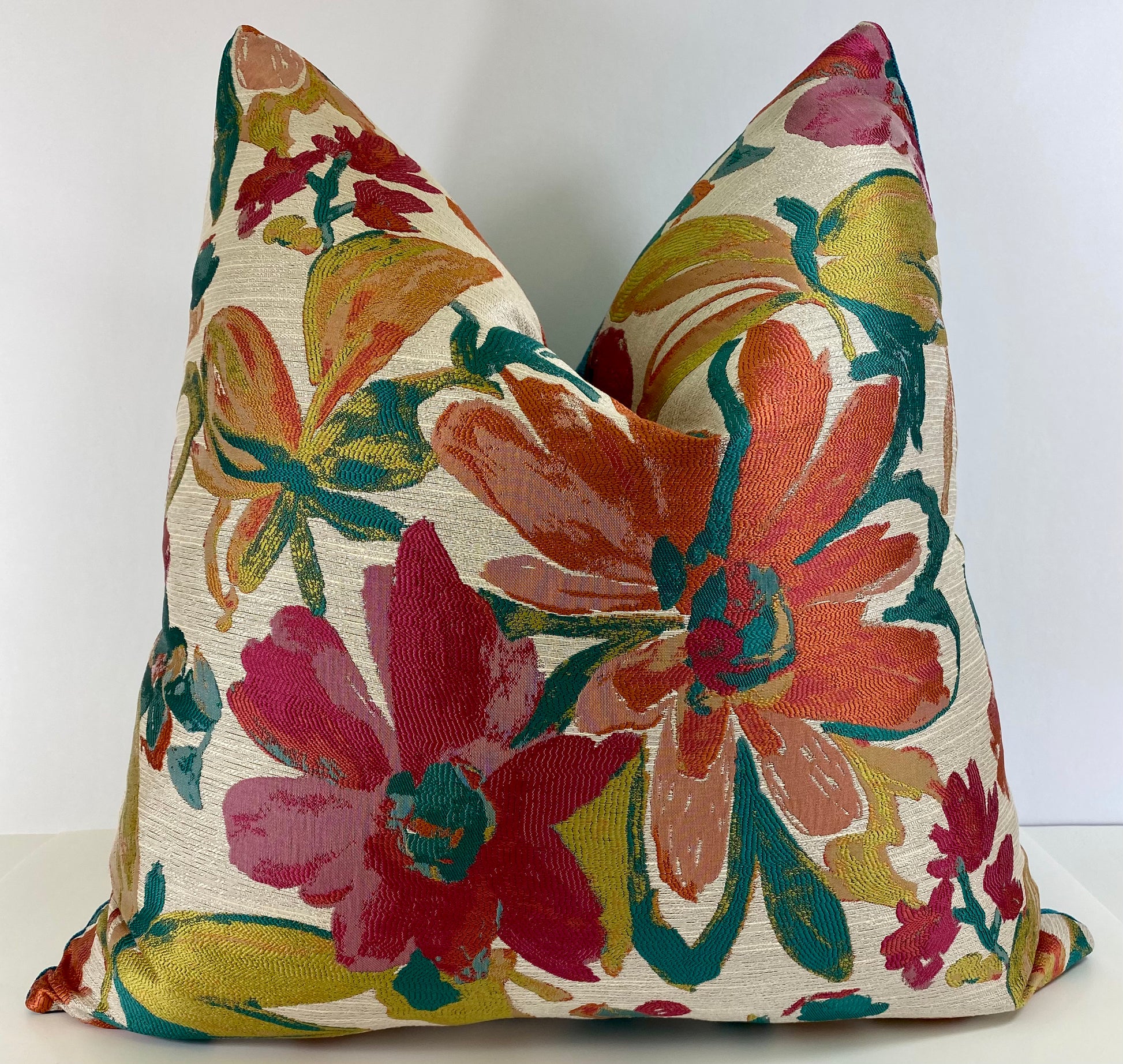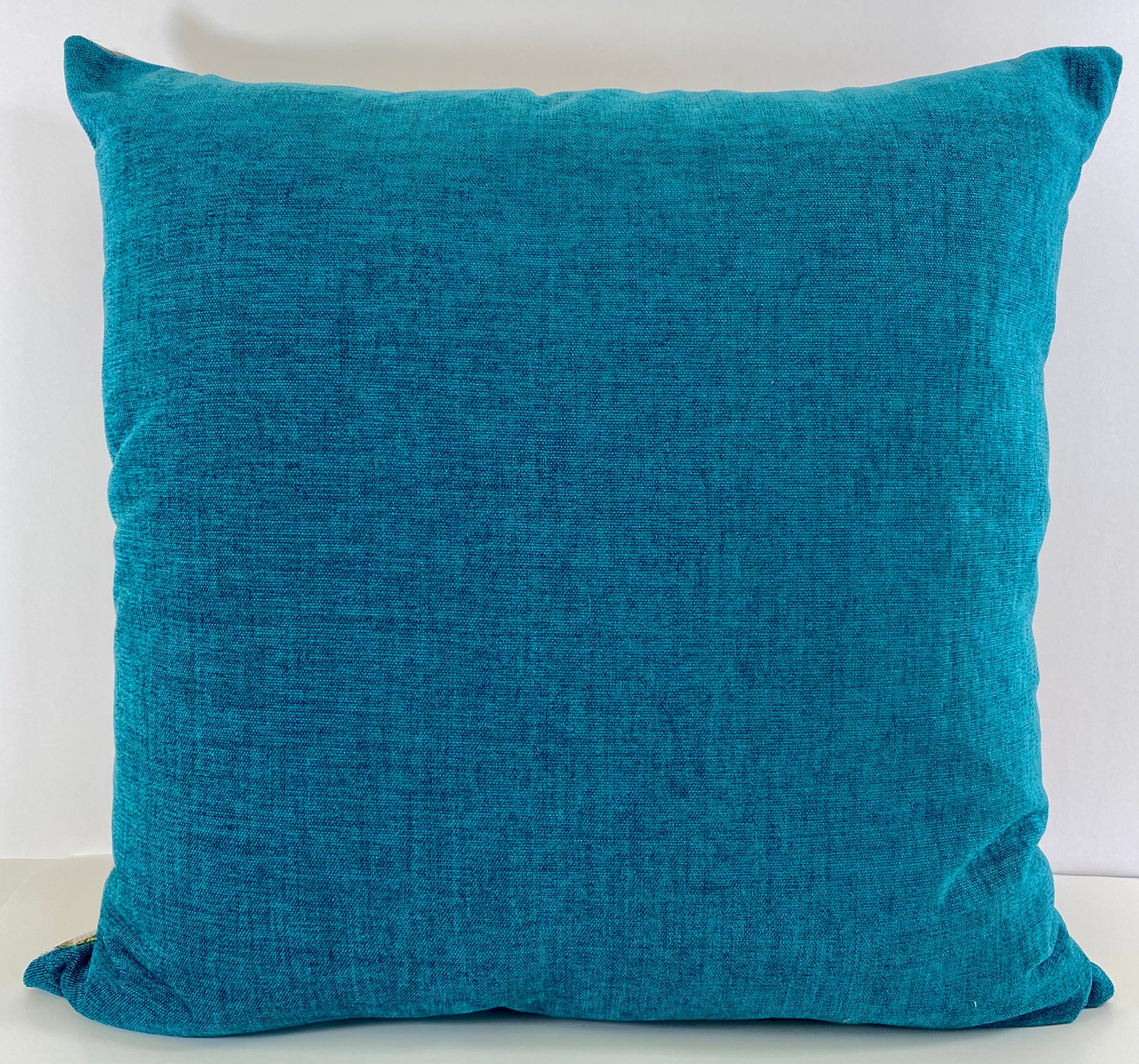 The back of this pillow is available as a solids you can get the full co-ordinated look. It is called LAGUNA TEAL. This pillow is 24" x 24" when measured flat with no filling. With filling it is 6" deep. It contains feather and down filling and is made in America. Brightly colored embroidered floral with teal back