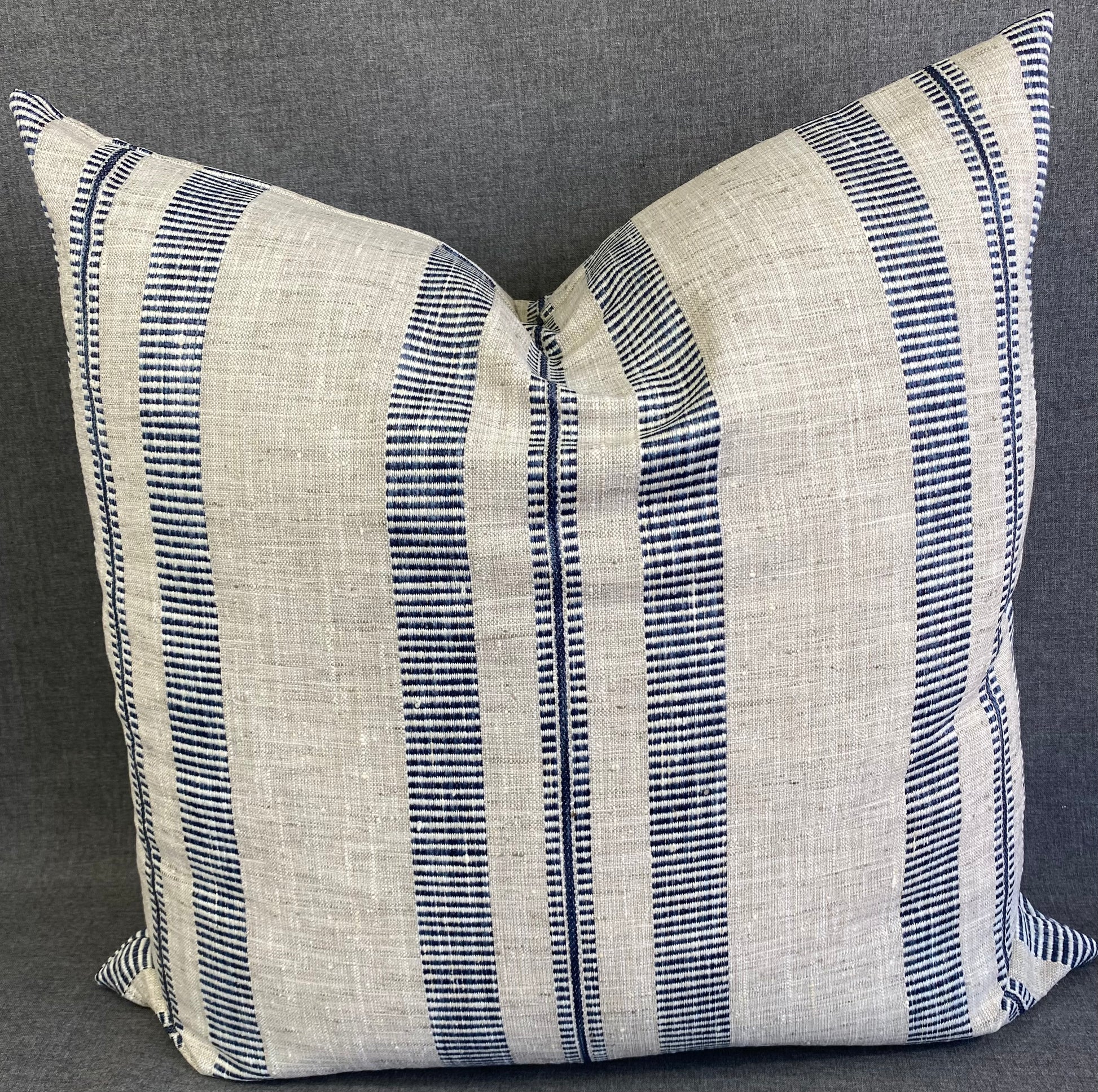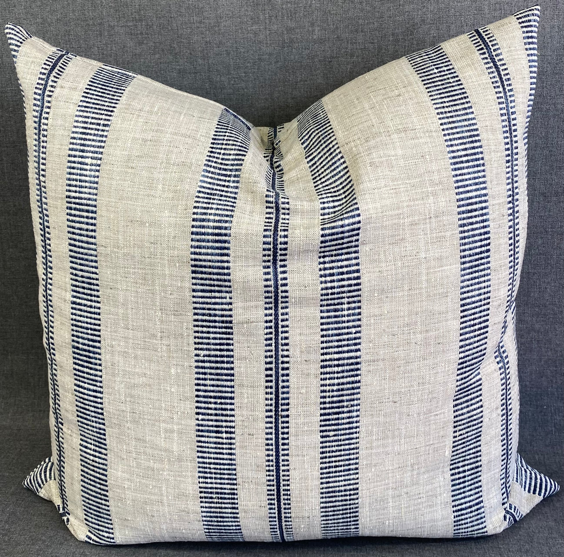 This pillow is 24" x 24" when measured flat with no filling. With filling it is 6" deep. It contains feather and down filling and is made in America. A multi textural linen fabric embroidered with blue stripes on a tan background. Same on both sides