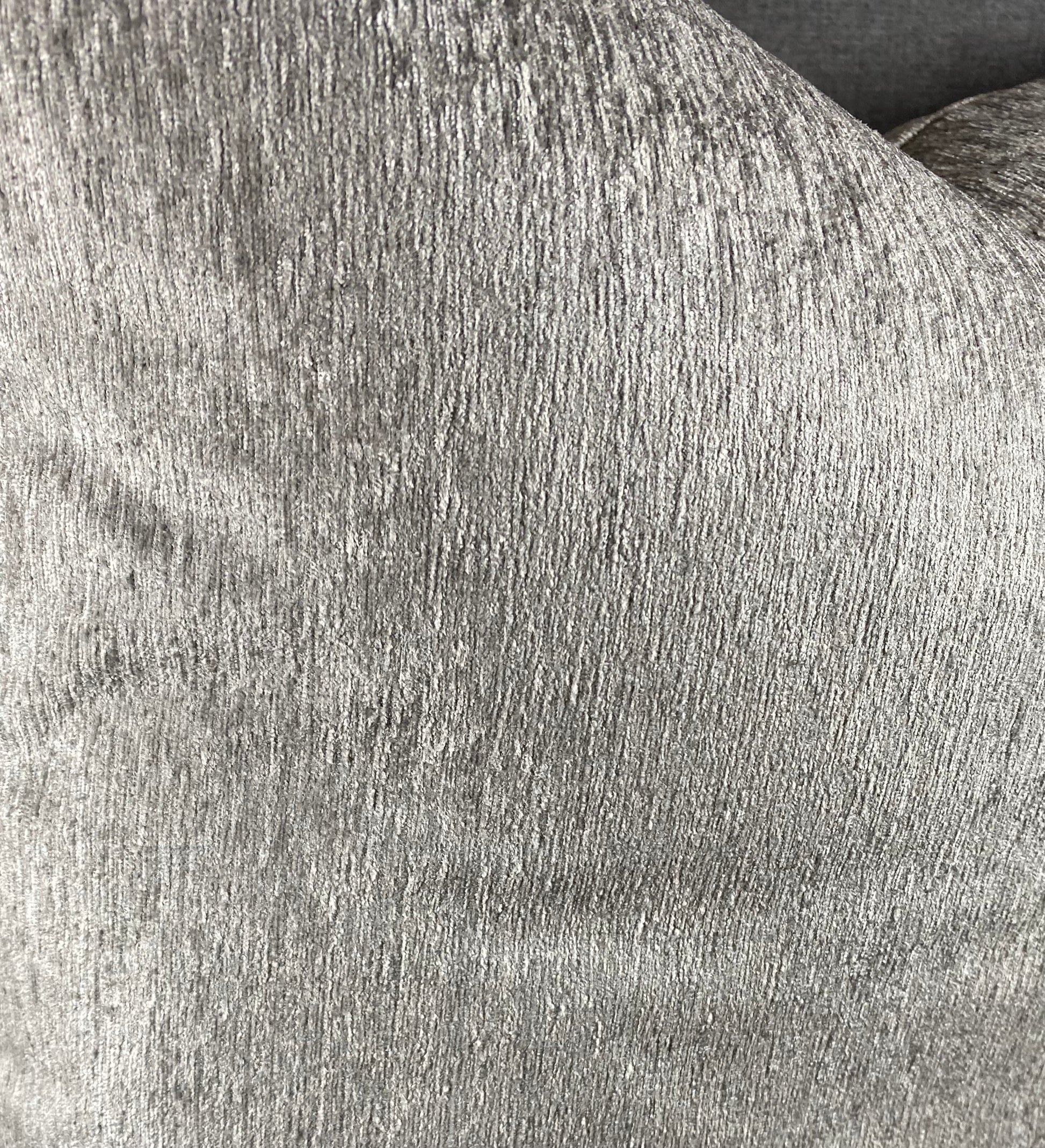 This pillow is 24" x 24" when measured flat with no filling. With filling it is 6" deep. It contains feather and down filling and is made in America. Smoke grey chenille fabric on both front and back.