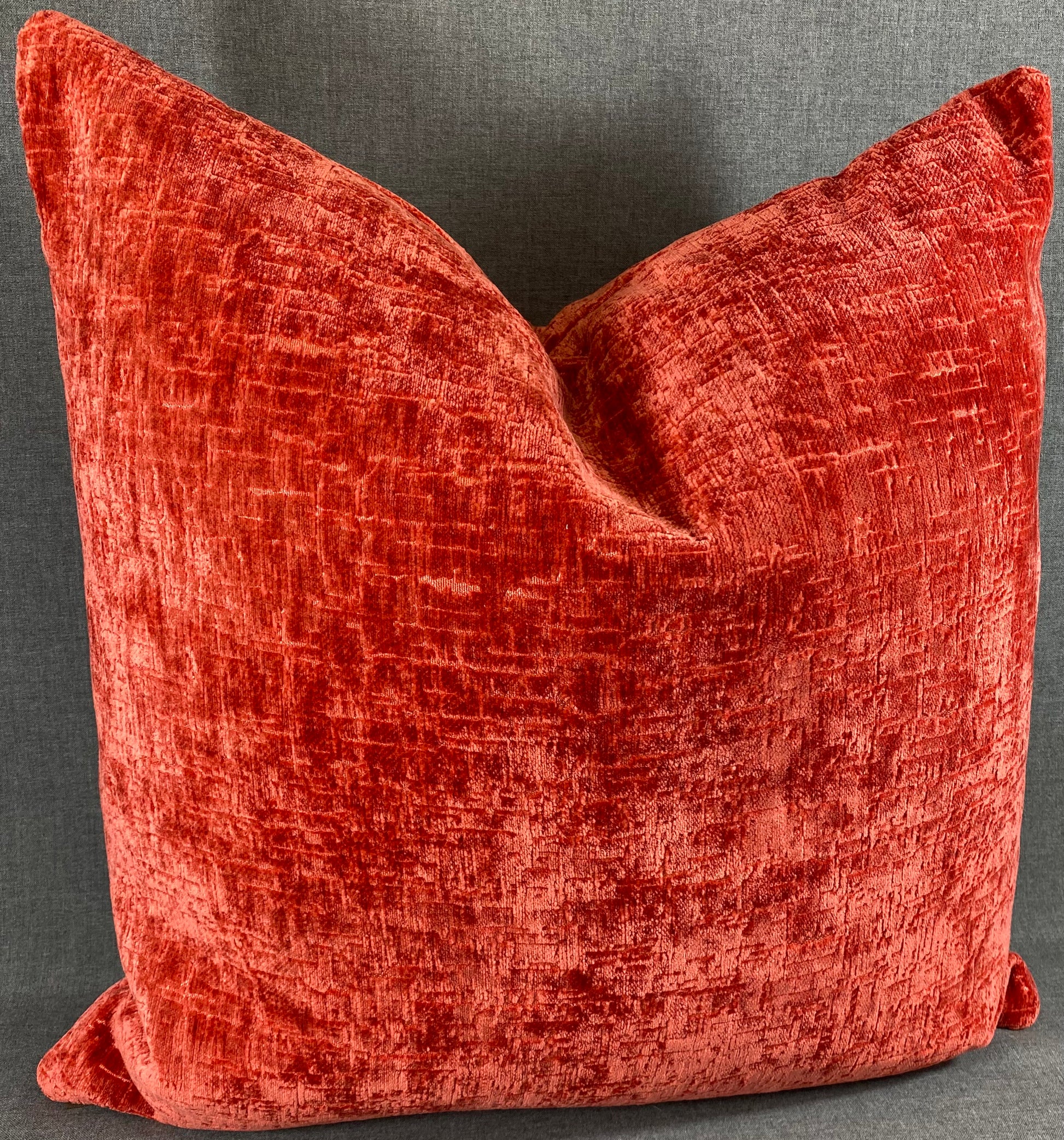 The handle of this fabric is lush. The color really is a true coral spotted velvet as you see it here. This pillow is 24" x 24" when measured flat with no filling. With filling it is 6" deep. It contains feather and down filling and is made in America. Red orange textured chenille.