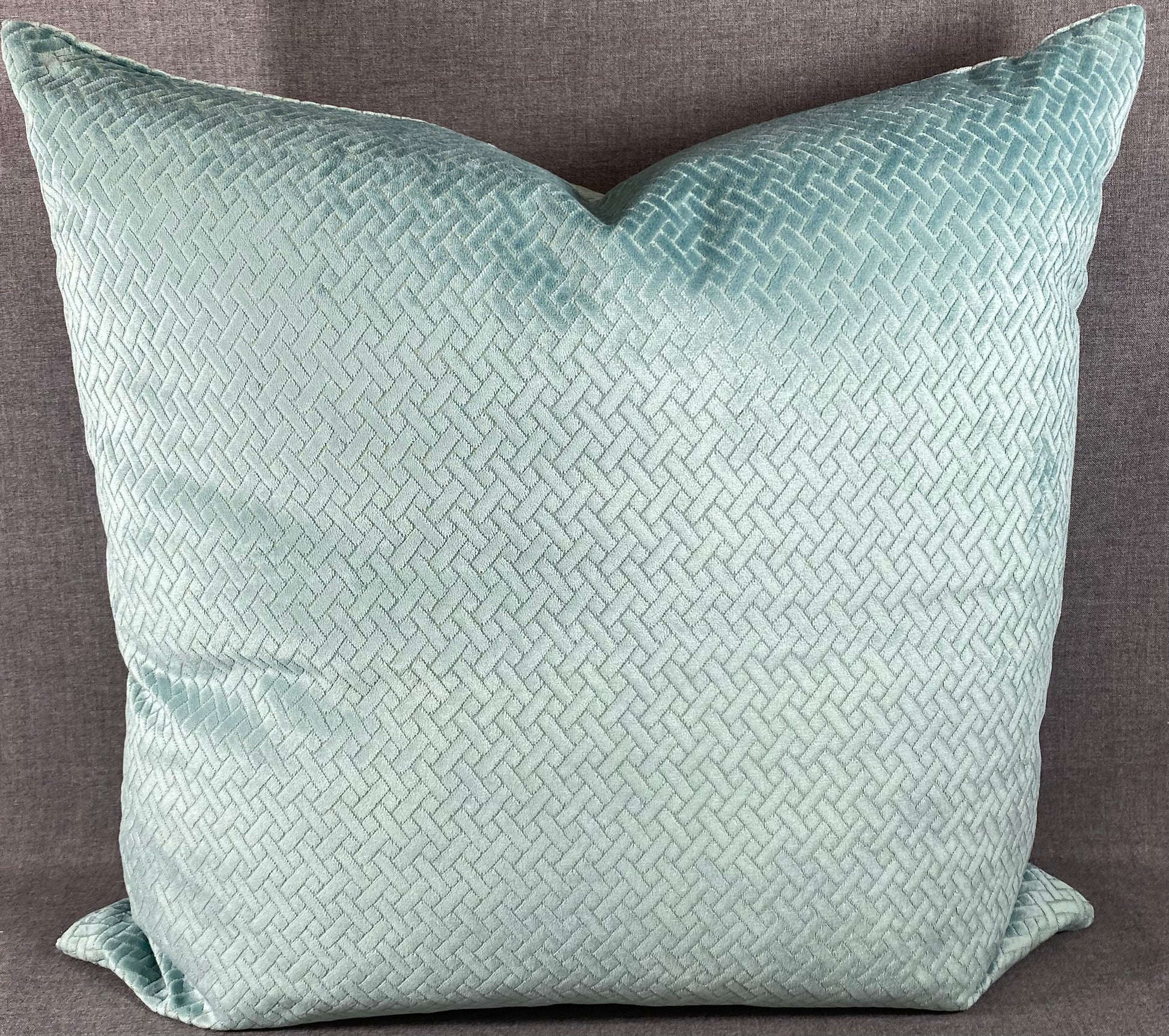 This pillow is 24" x 24" when measured flat with no filling. With filling it is 6" deep. It contains feather and down filling and is made in America. Brilliant blue solid fabric with a basketweave pattern.