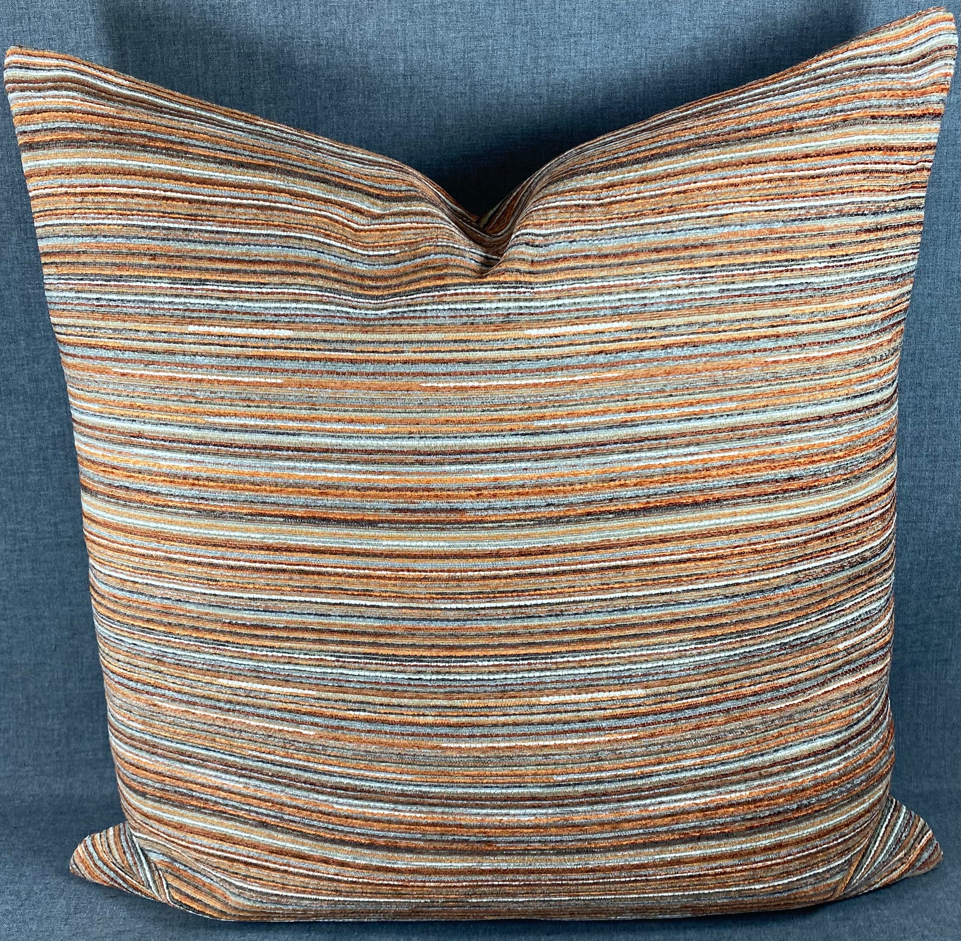 This pillow is 24" x 24" when measured flat with no filling. With filling it is 6" deep. It contains feather and down filling and is made in America. Lush textured stripes of orange, brown, copper, orange, gold, grey and white on both sides.