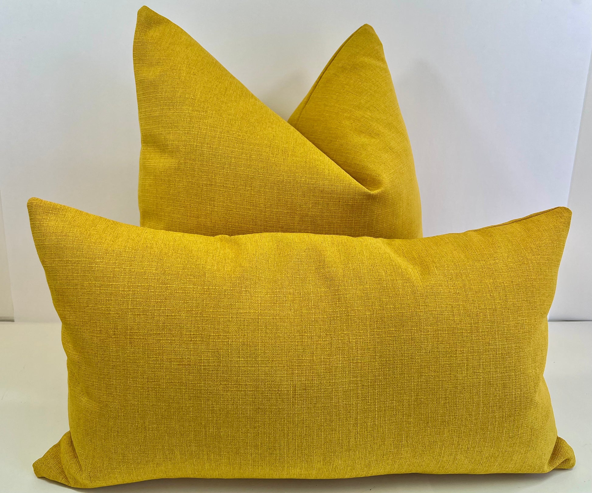 Transport yourself to the beaches in the South of France with this hot yellow pillow. Dress up with black and white for a crisp clean look. 24" x 24" when measured flat with no filling. With filling it is 6" deep. It contains feather and down filling and is made in America. Lightly textured bright yellow front and back.