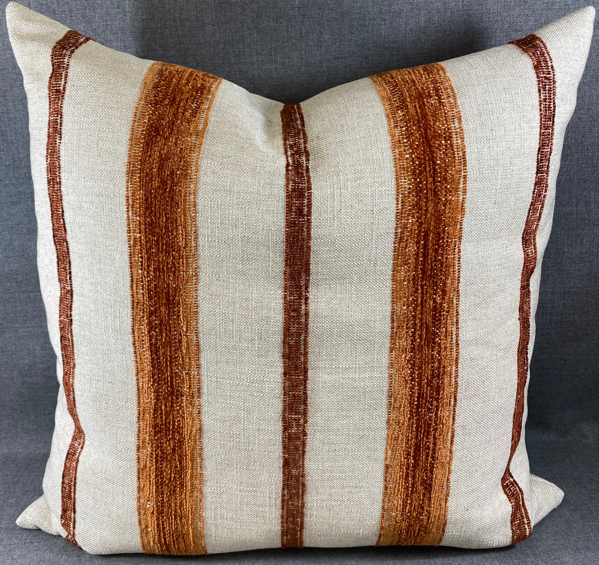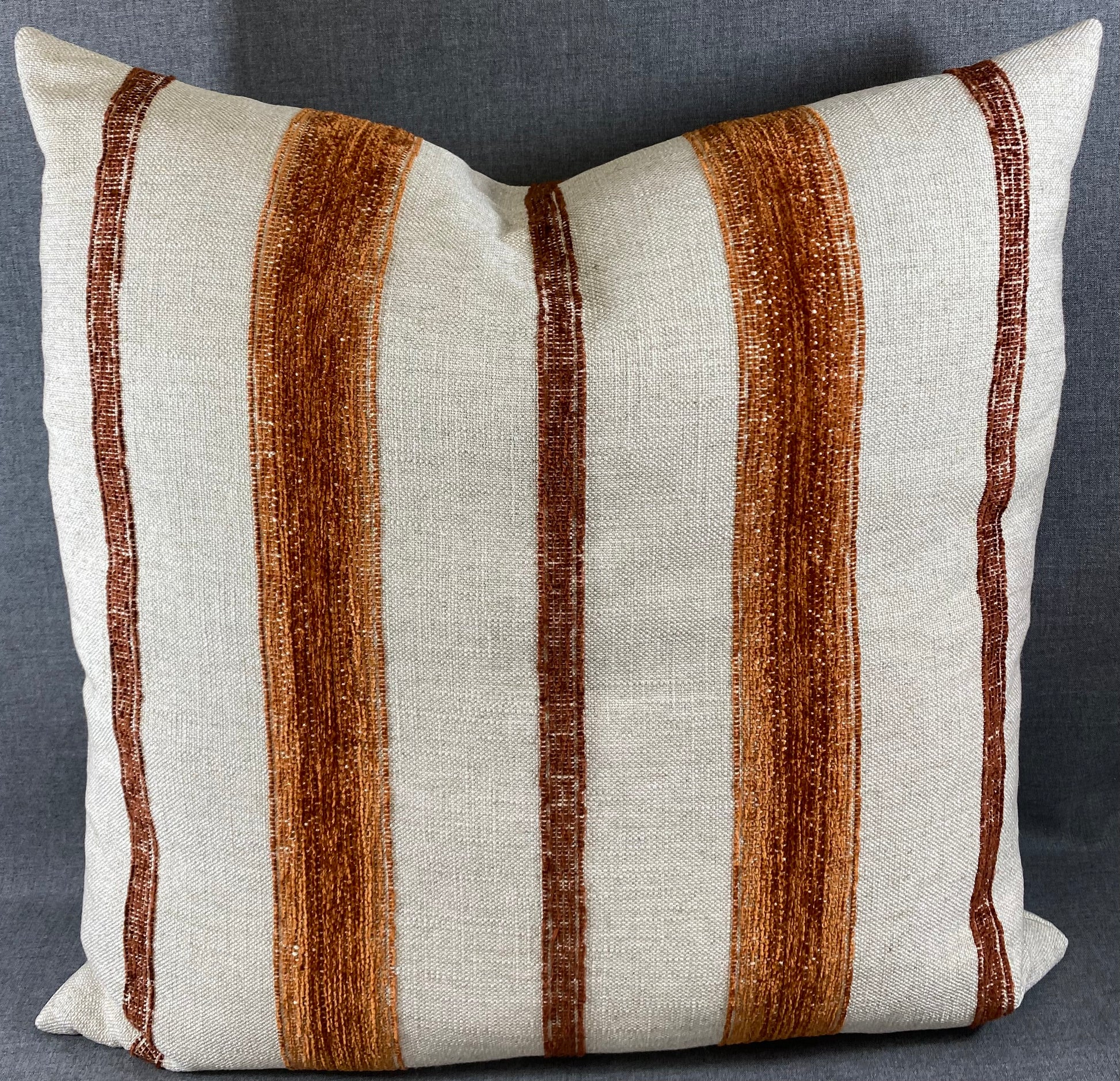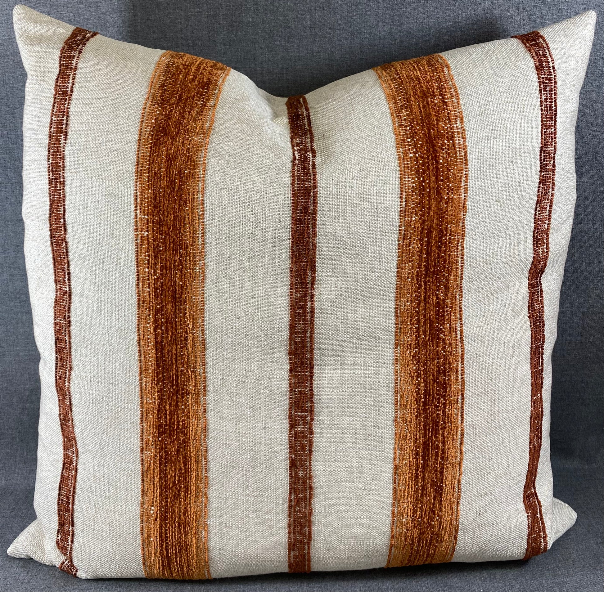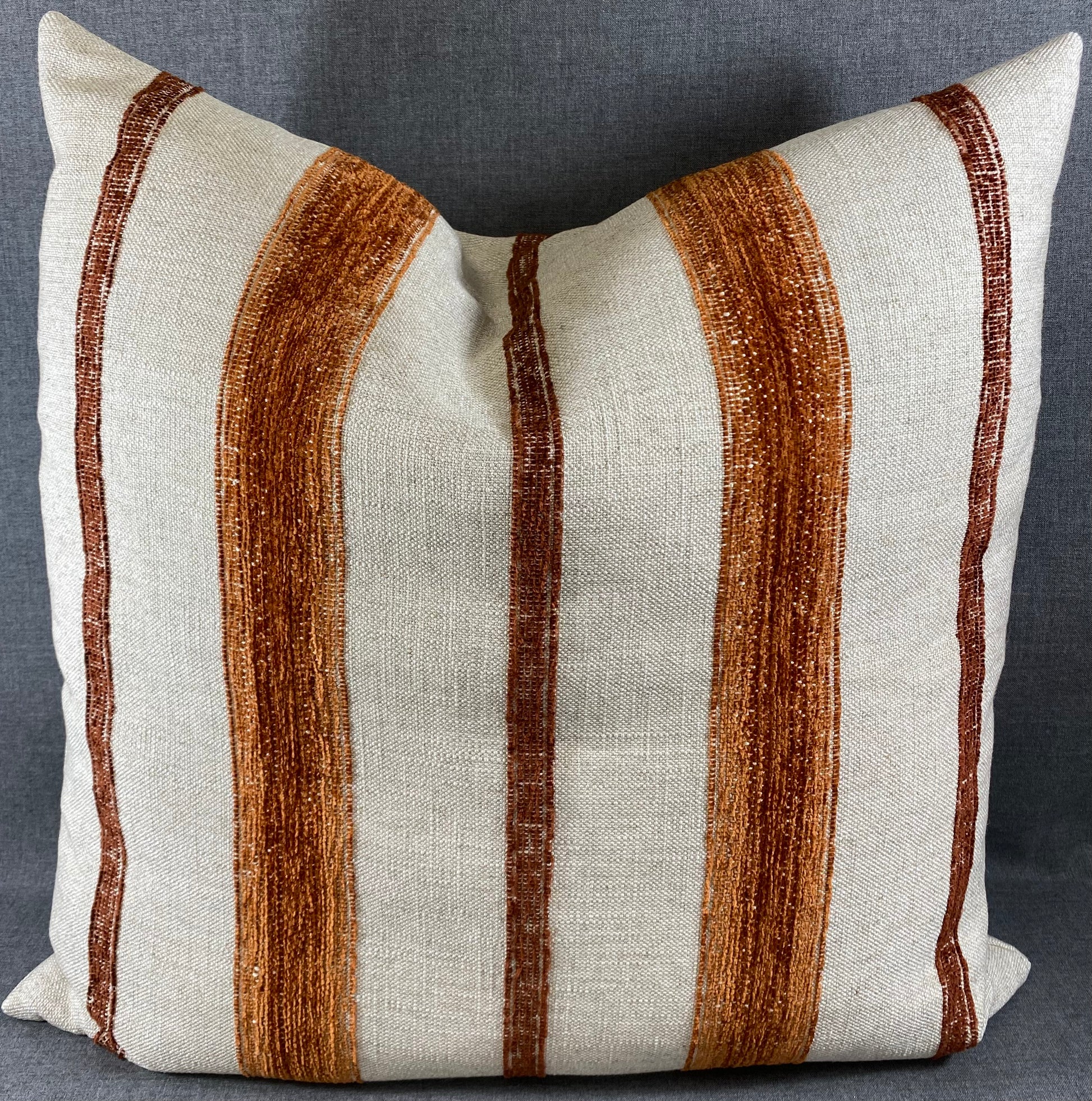 Limited edition. This pillow is 24" x 24" when measured flat with no filling. With filling it is 6" deep. It contains feather and down filling and is made in America. Textural weave beige fabric with rust embroidered stripes. Same on both sides.