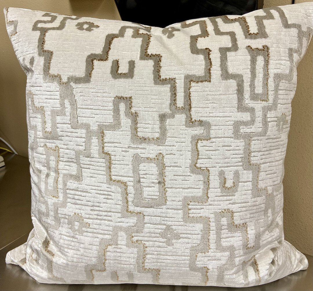 This pillow is 24" x 24" when measured flat with no filling. With filling it is 6" deep. It contains feather and down filling and is made in America. A beautiful white textured chenille with silver and taupe design.