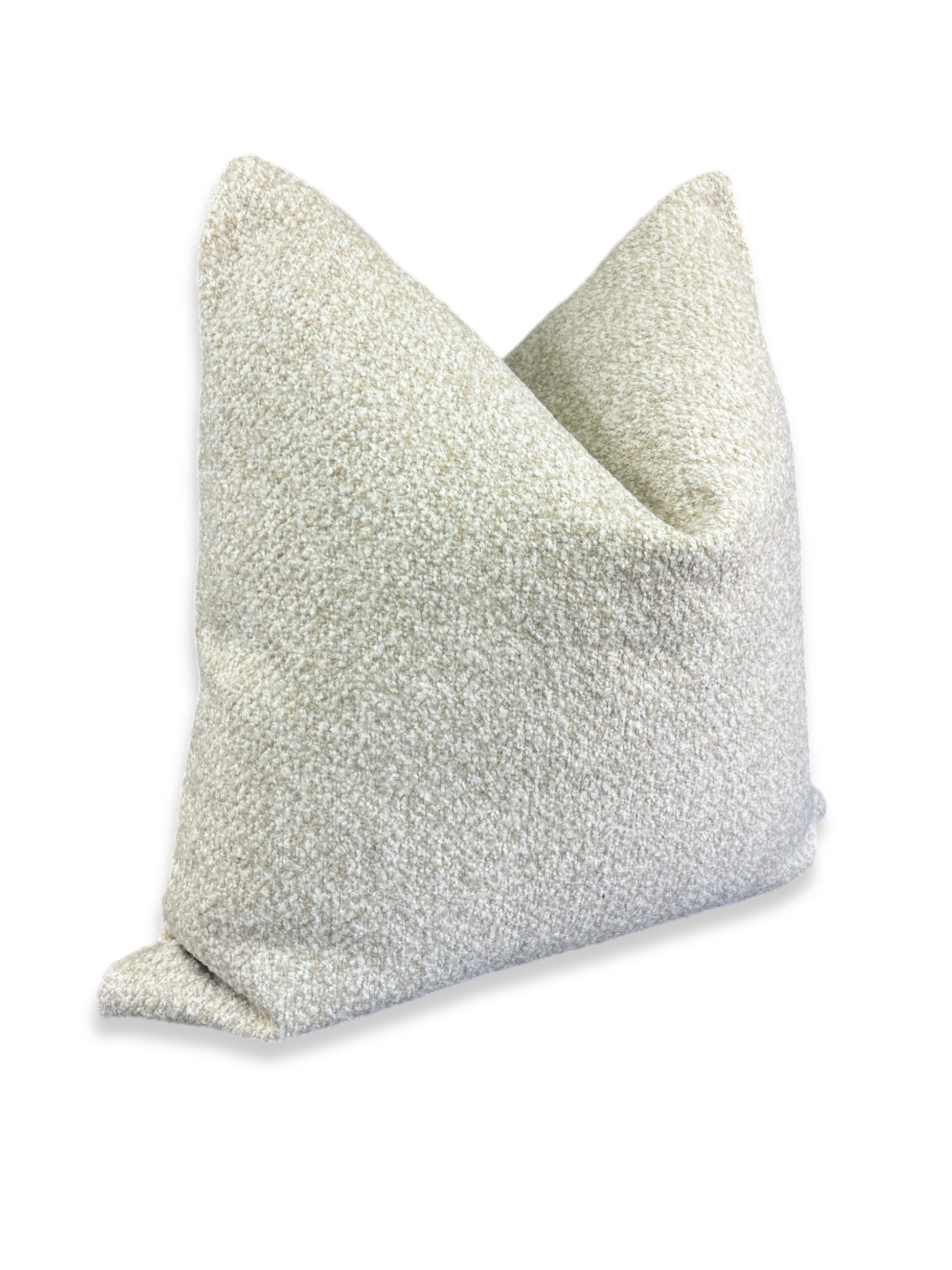 This pillow is 24" x 24" when measured flat with no filling. With filling it is 6" deep. It contains feather and down filling and is made in America. Cozy and soft textured fabric in a creamy light tan and ivory