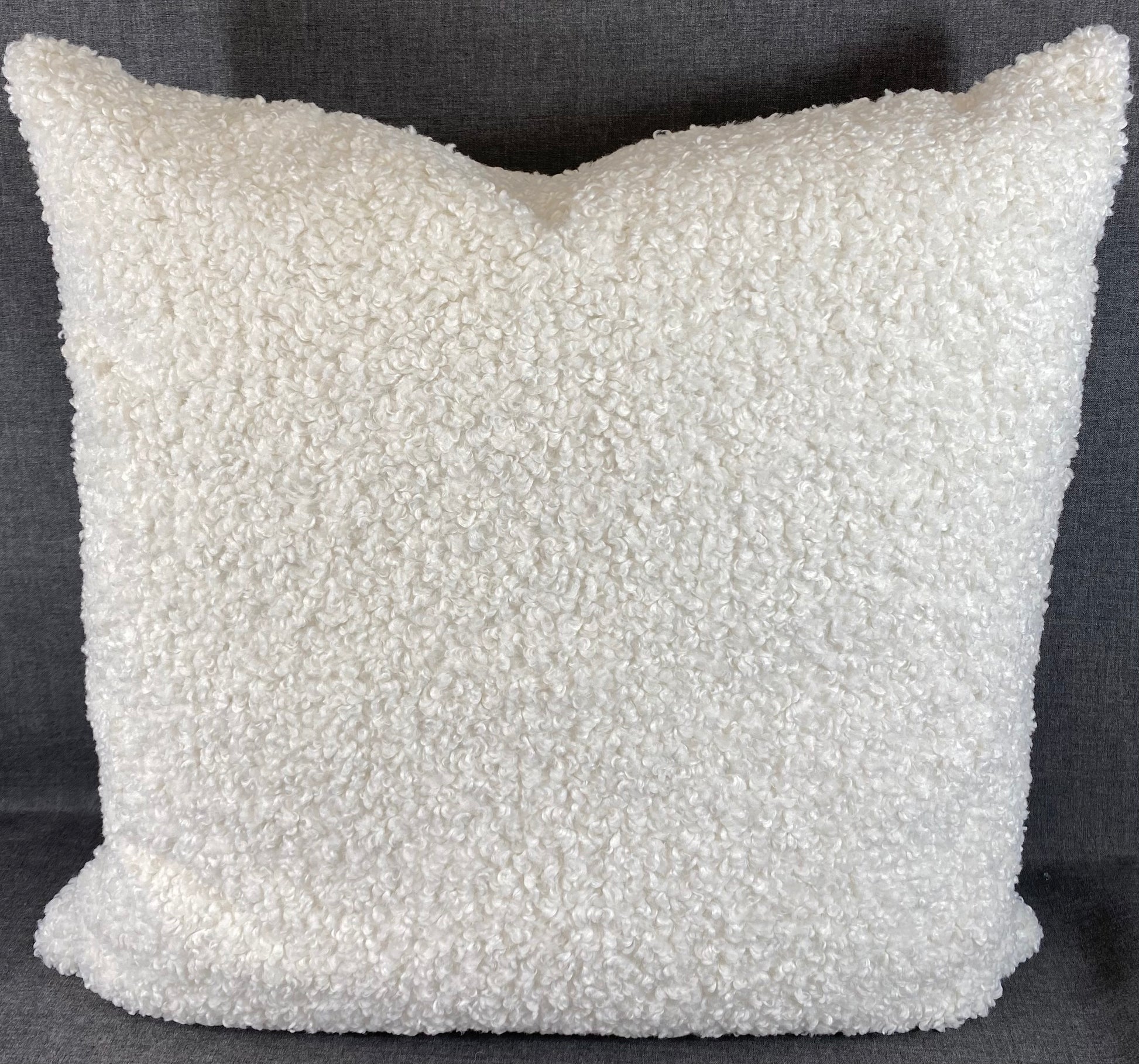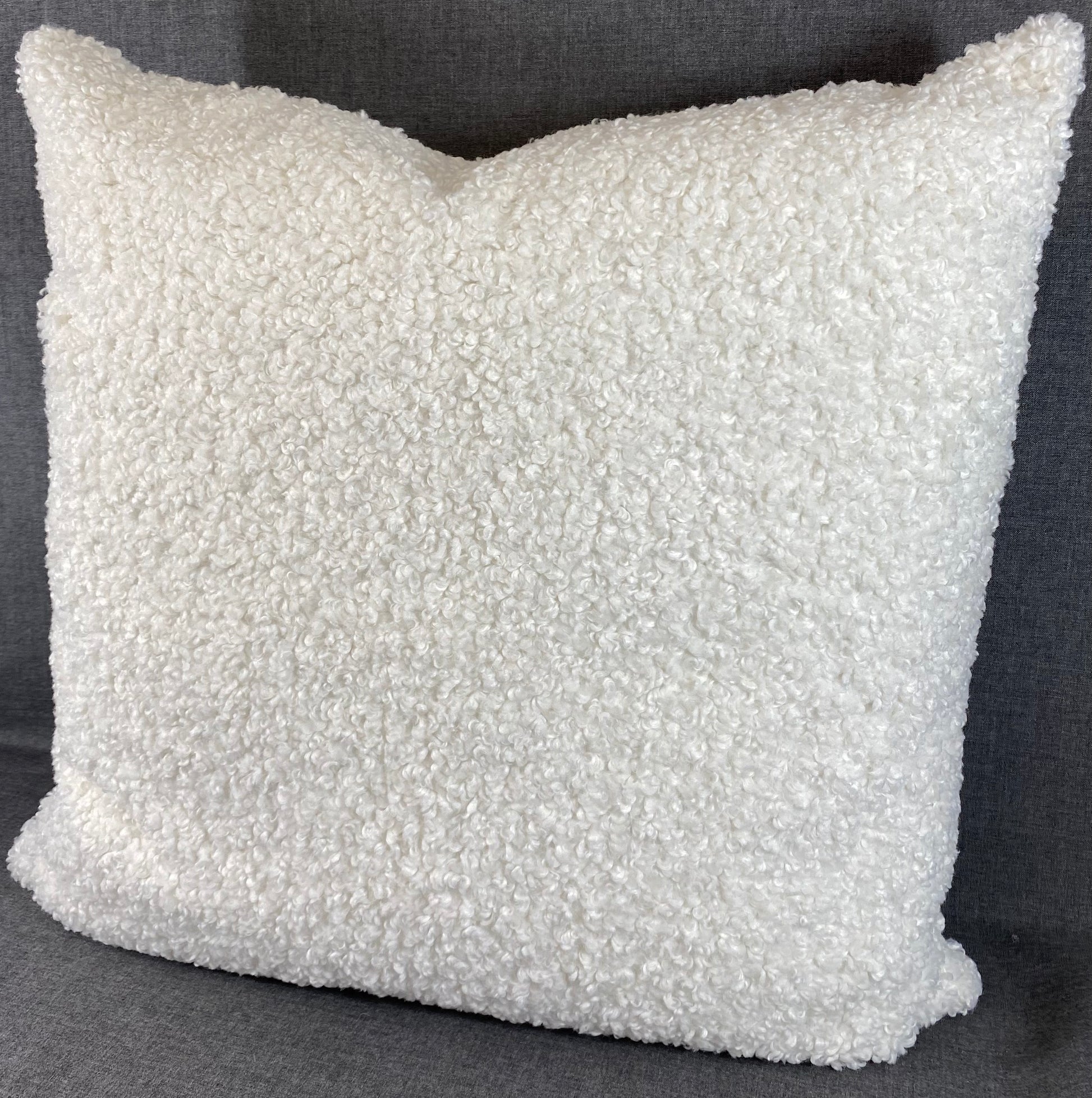 This pillow is 24" x 24" when measured flat with no filling. With filling it is 6" deep. It contains feather and down filling and is made in America. Poodle like hair fiber in bright white color, very soft to the touch.