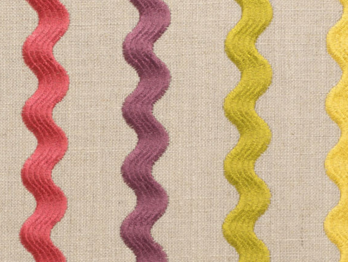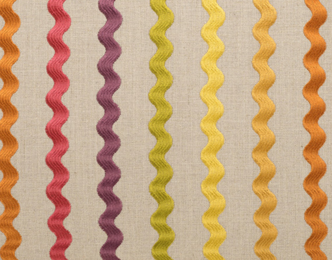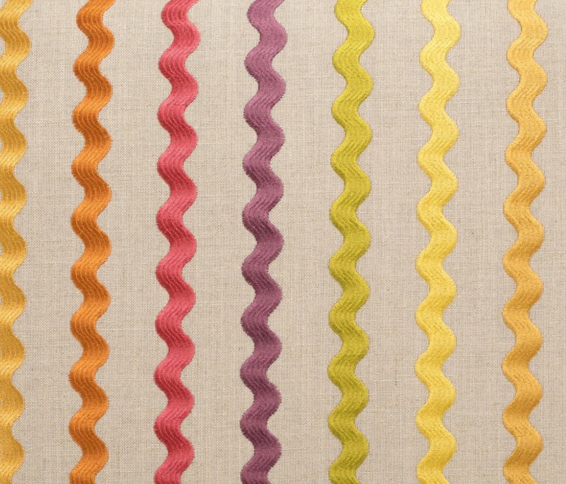 This pillow is 24" x 24" when measured flat with no filling. With filling it is 6" deep. It contains feather and down filling and is made in America. These are limited production runs until the fabric is gone. Embroidered wavy stripes of green, yellow, orange, fuchsia and purple on a cream background.