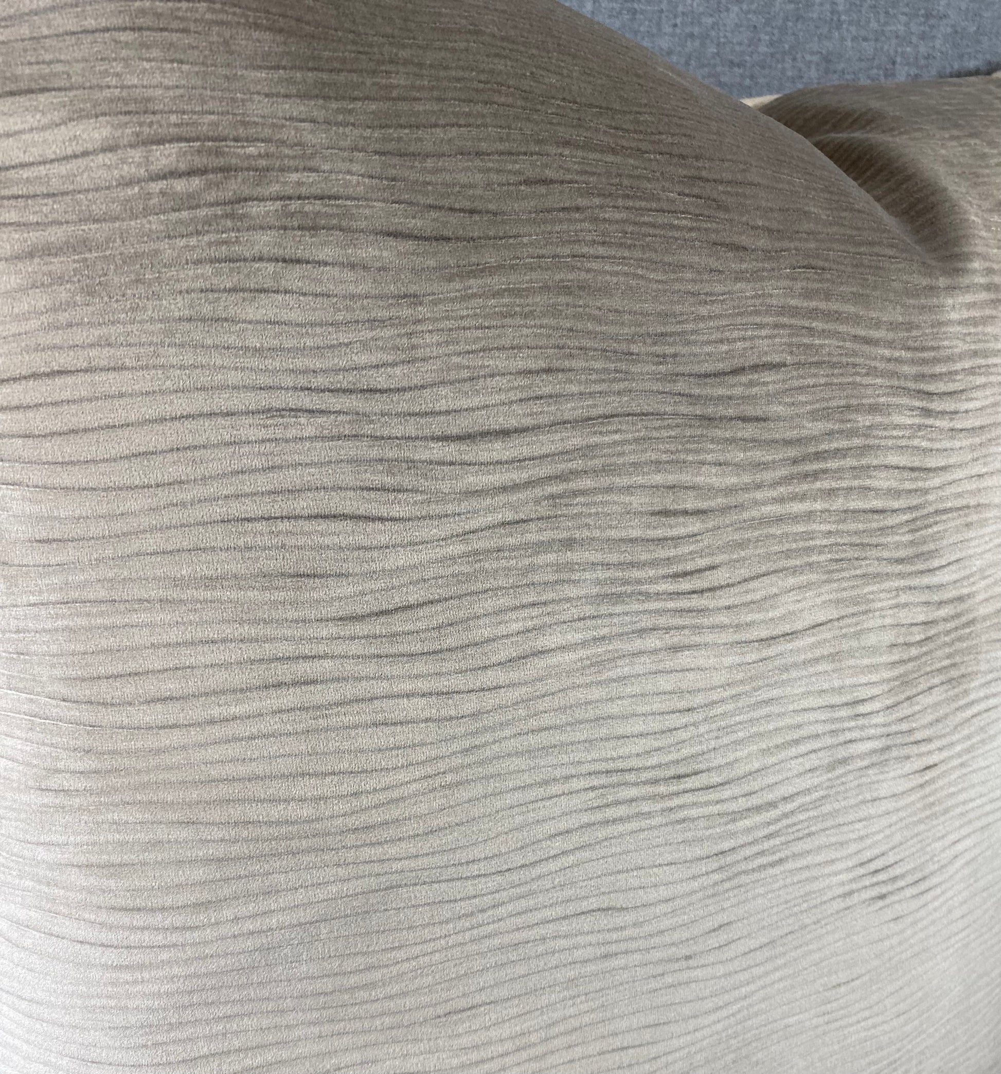 This pillow is 24" x 24" when measured flat with no filling. With filling it is 6" deep. It contains feather and down filling and is made in America. Solid mushroom tan in a smooth wavey patterned fabric.