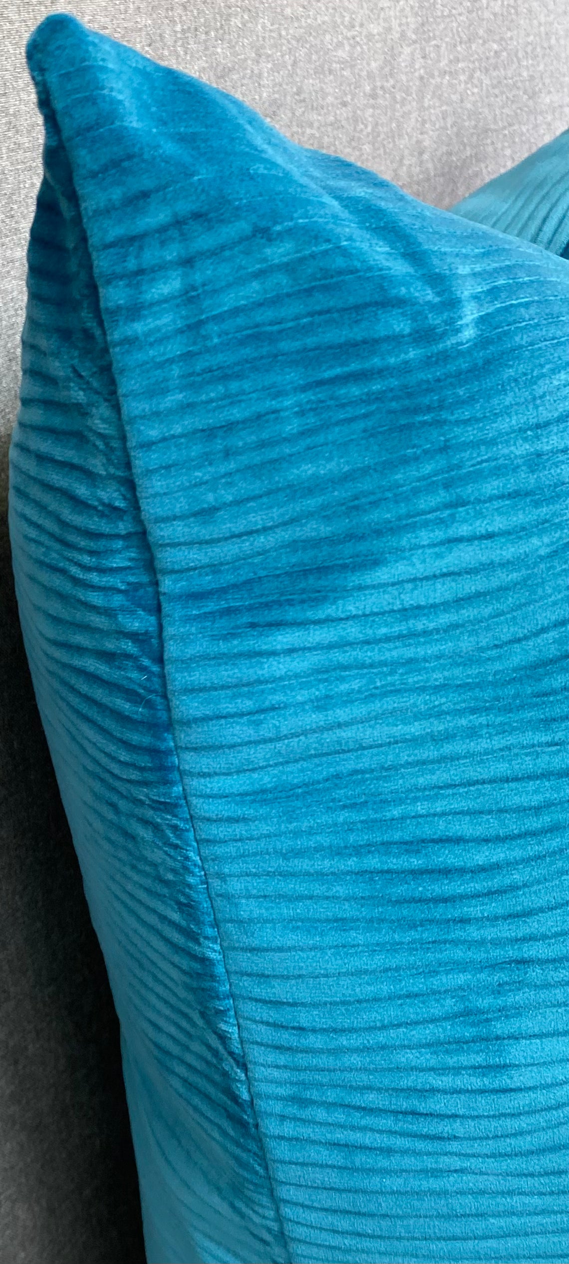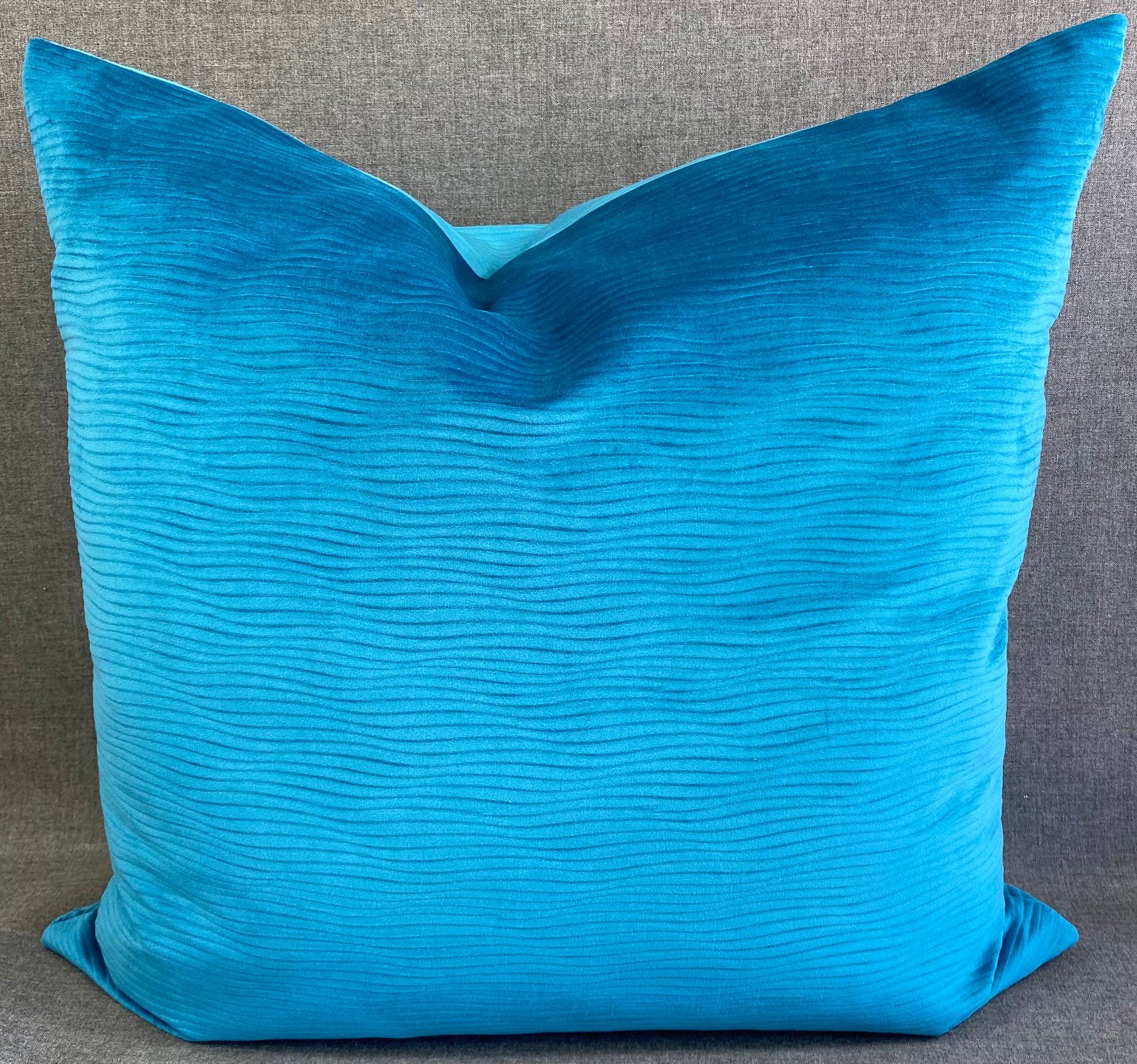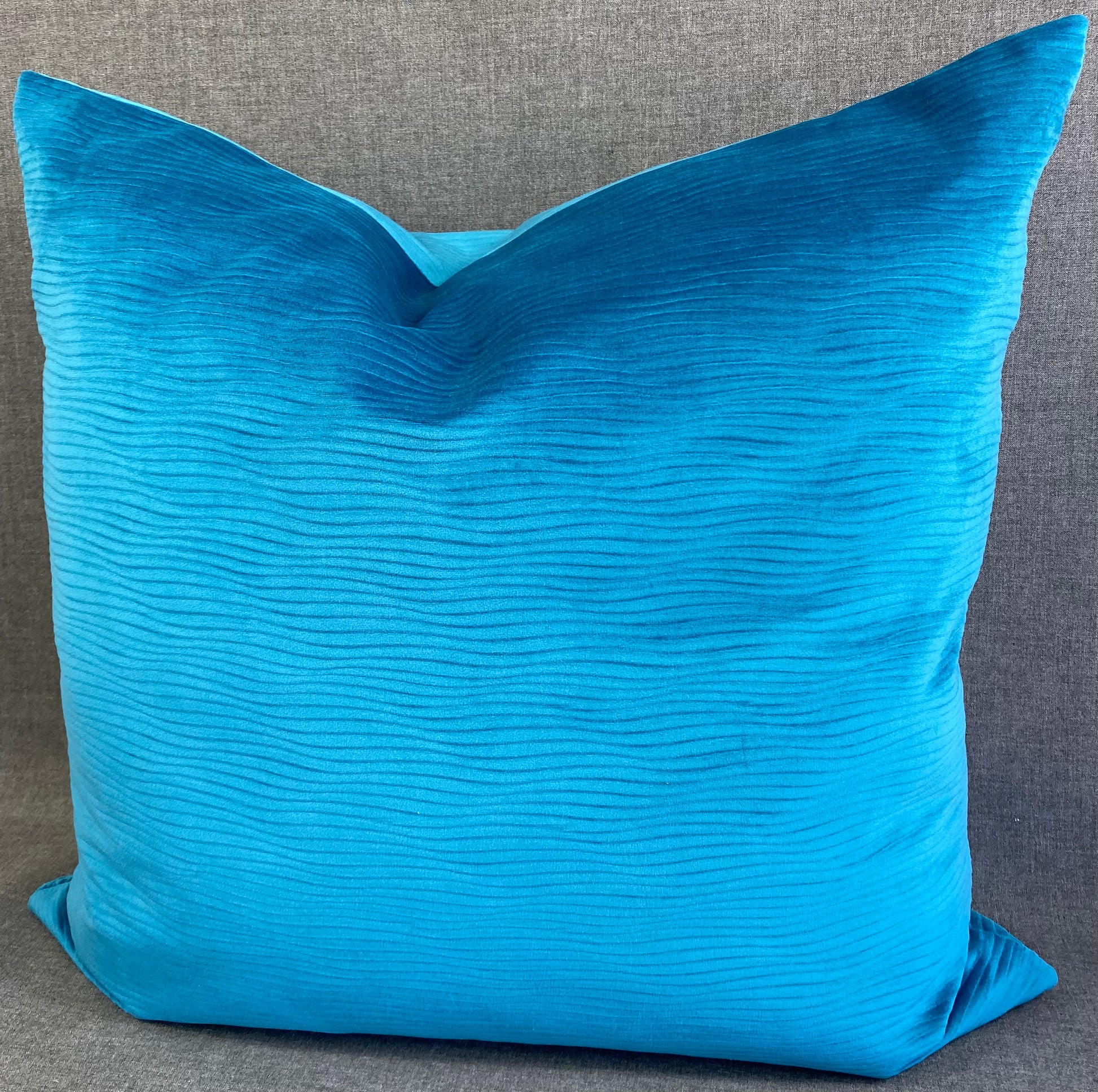 This pillow is 24" x 24" when measured flat with no filling. With filling it is 6" deep. It contains feather and down filling and is made in America. Solid peacock color in a smooth wavey patterned fabric
