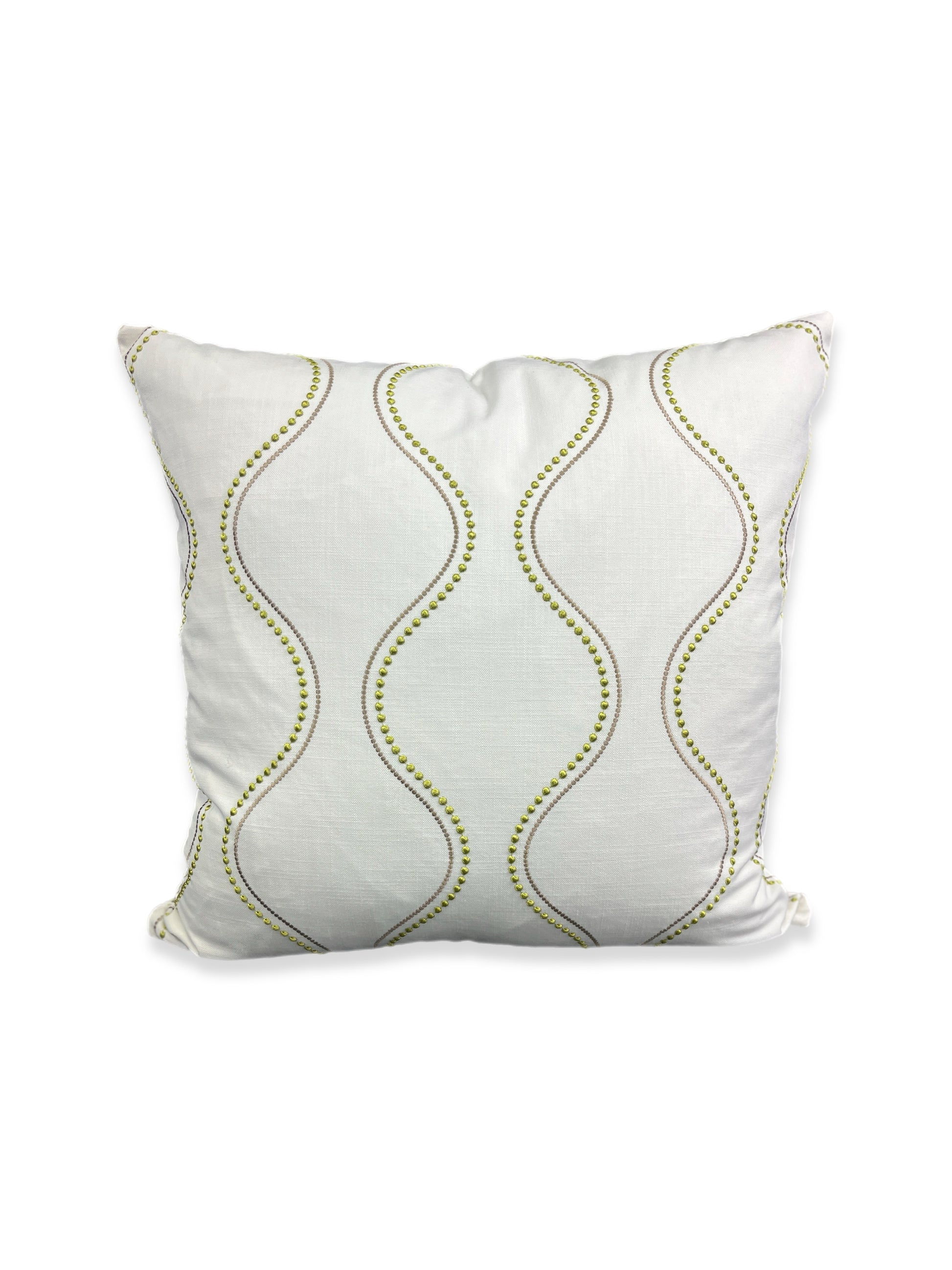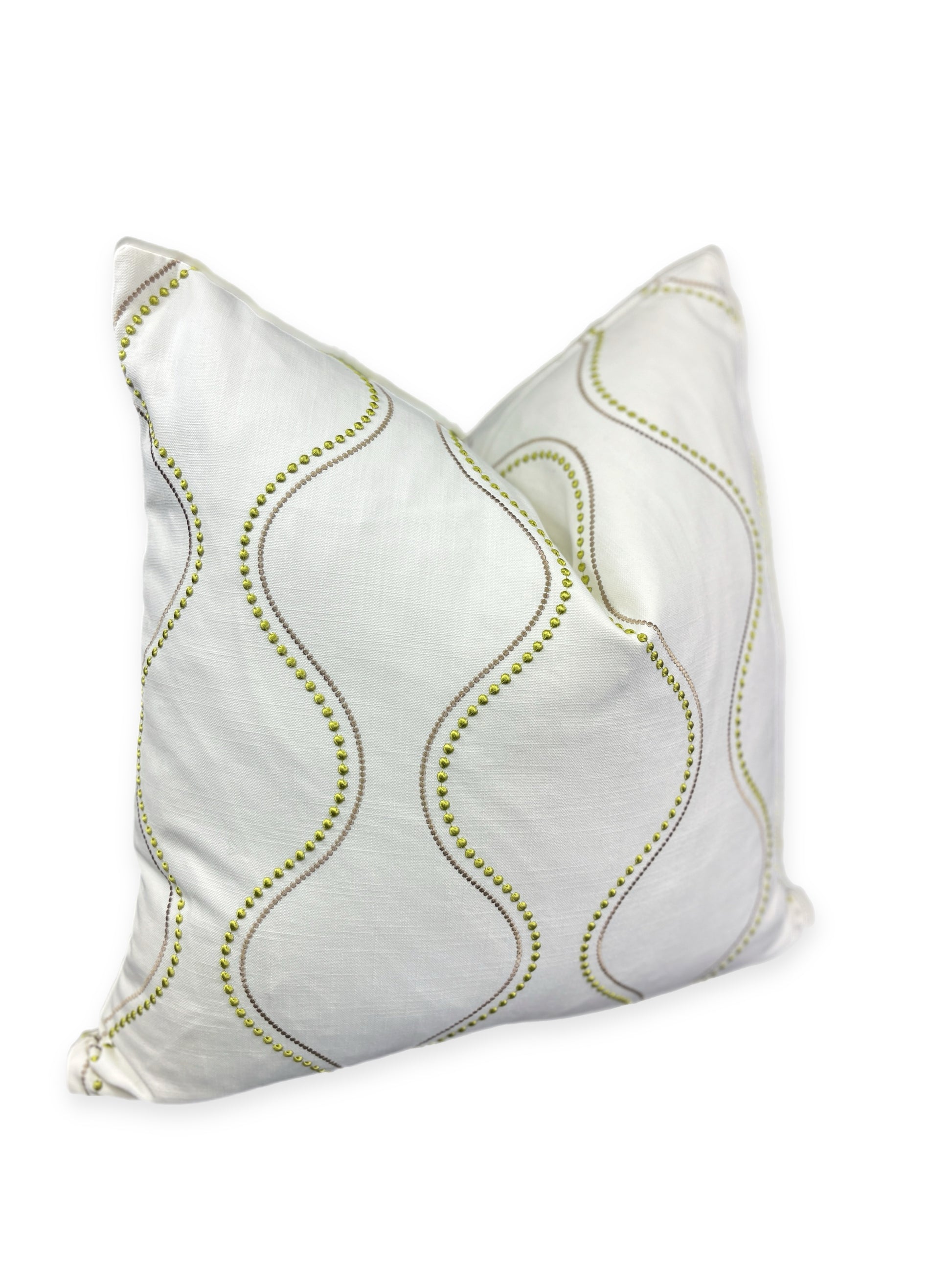 This pillow is 24" x 24" when measured flat with no filling. With filling it is 6" deep. It contains feather and down filling and is made in America. Embroidered design of succulent green dots and complimentary taupe lining on a crisp white background