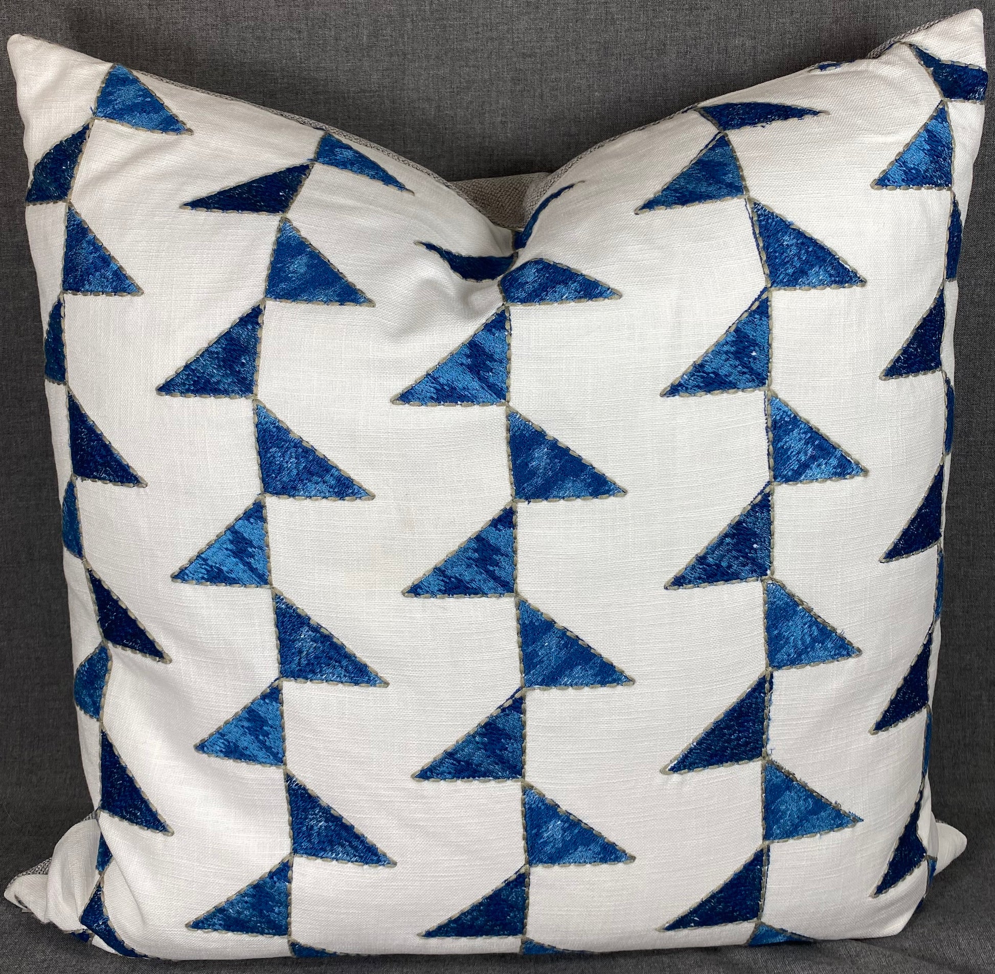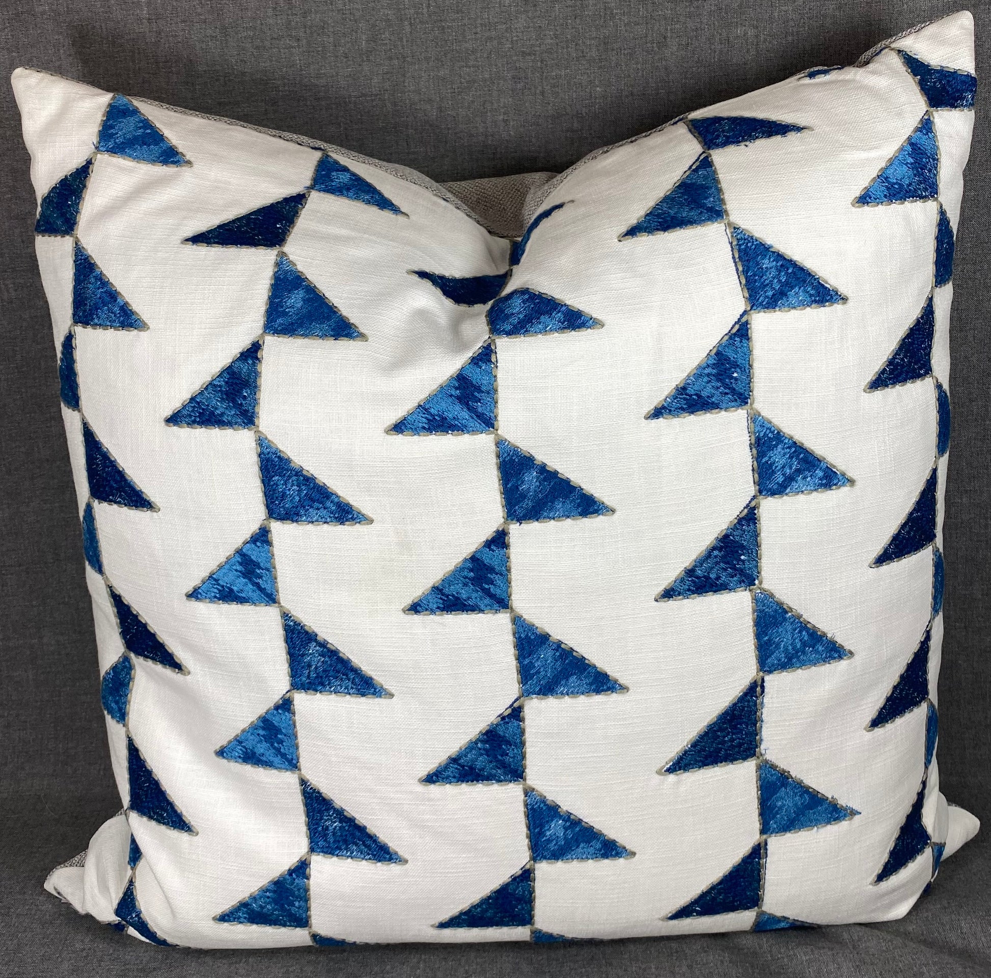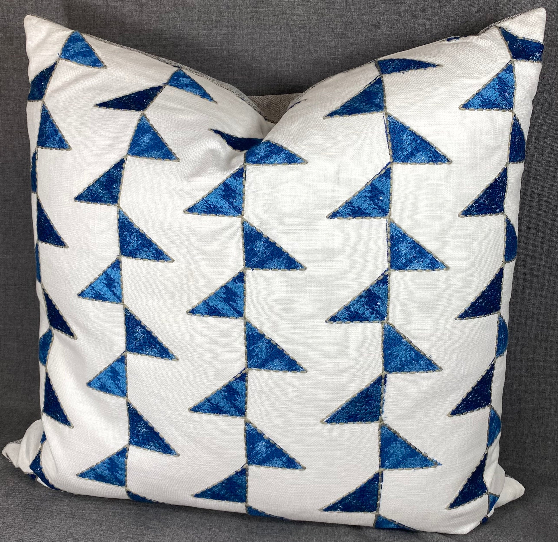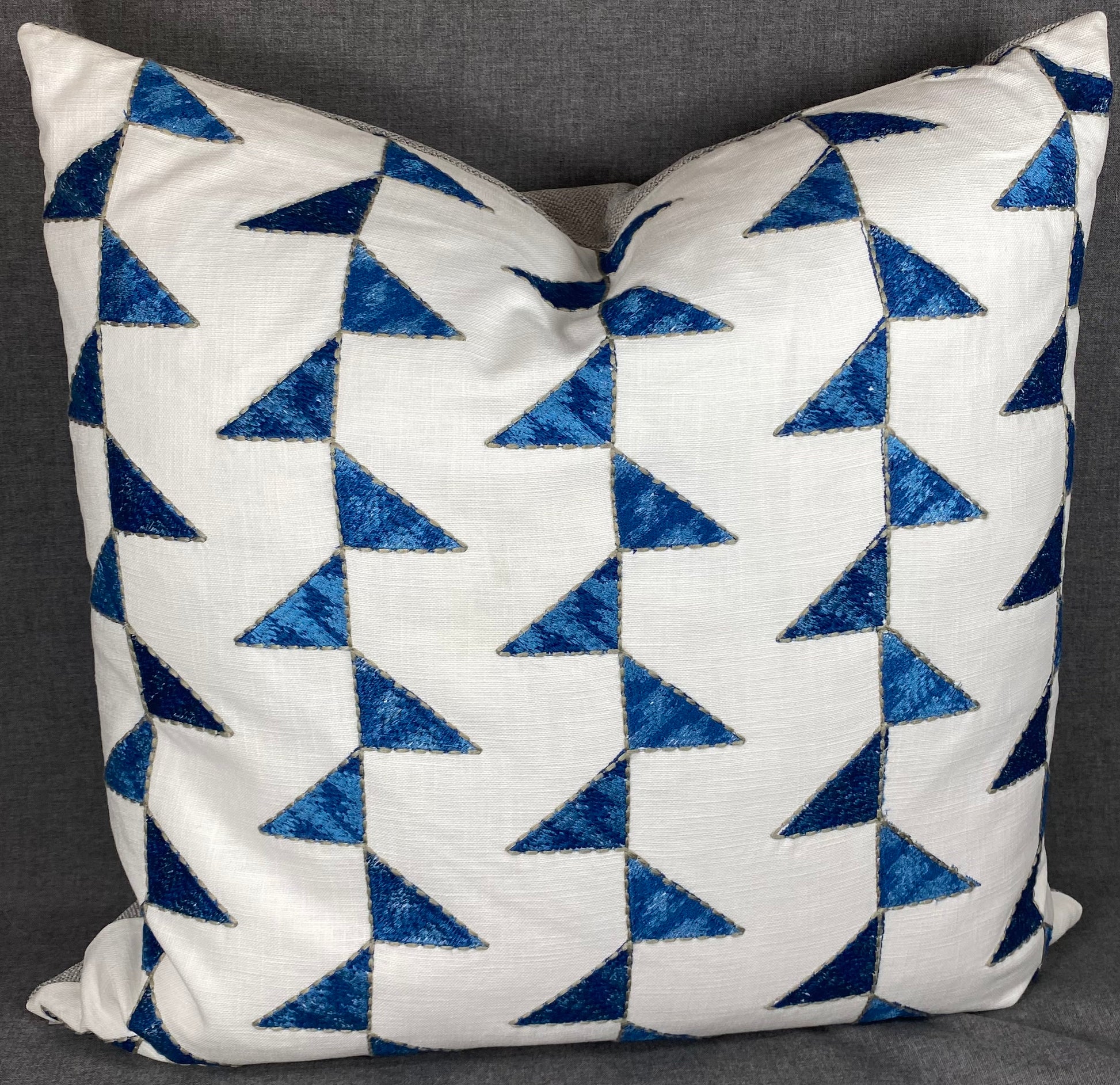 This pillow is 24" x 24" when measured flat with no filling. With filling it is 6" deep. It contains feather and down filling and is made in America. Embroidered shades of blue in the shape of sails outlined in grey stitching on a crisp white background. Sold grey fabric on the back.