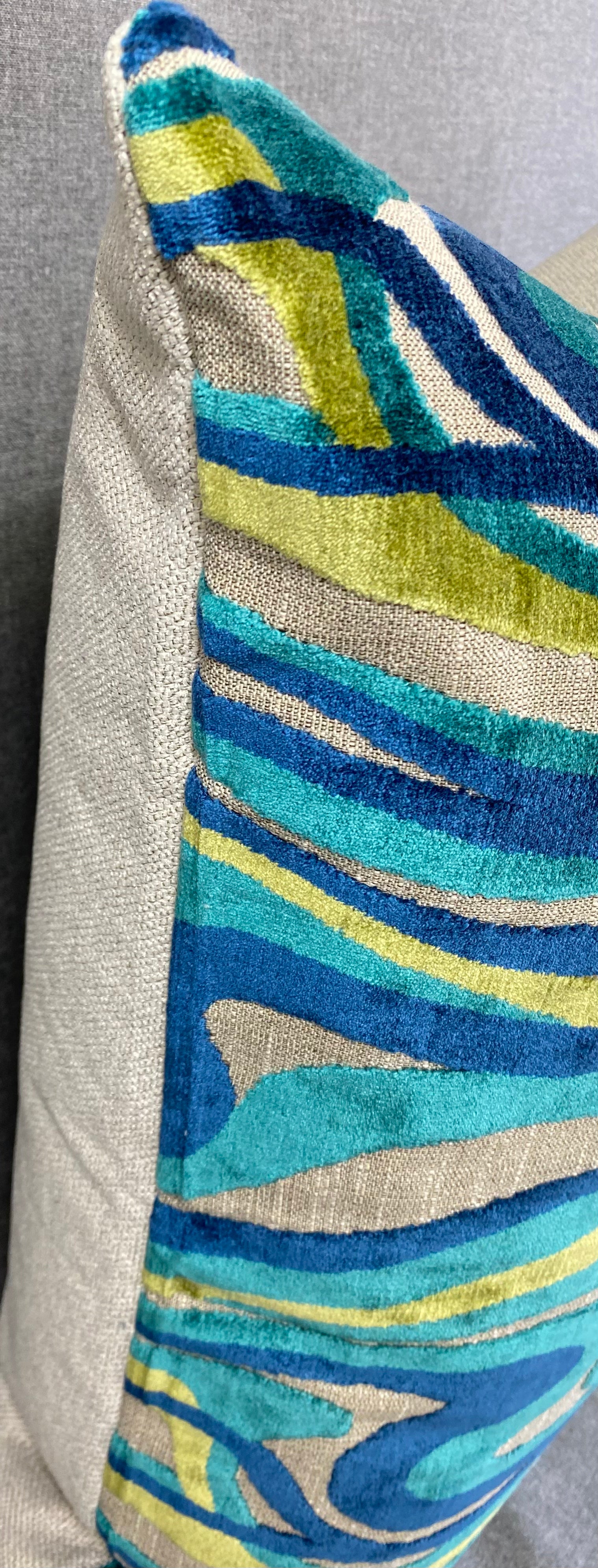 This pillow is 24" x 24" when measured flat with no filling. With filling it is 6" deep. It contains feather and down filling and is made in America. Raised velour swayed lines of teal, lime, green, and indigo on a taupe background