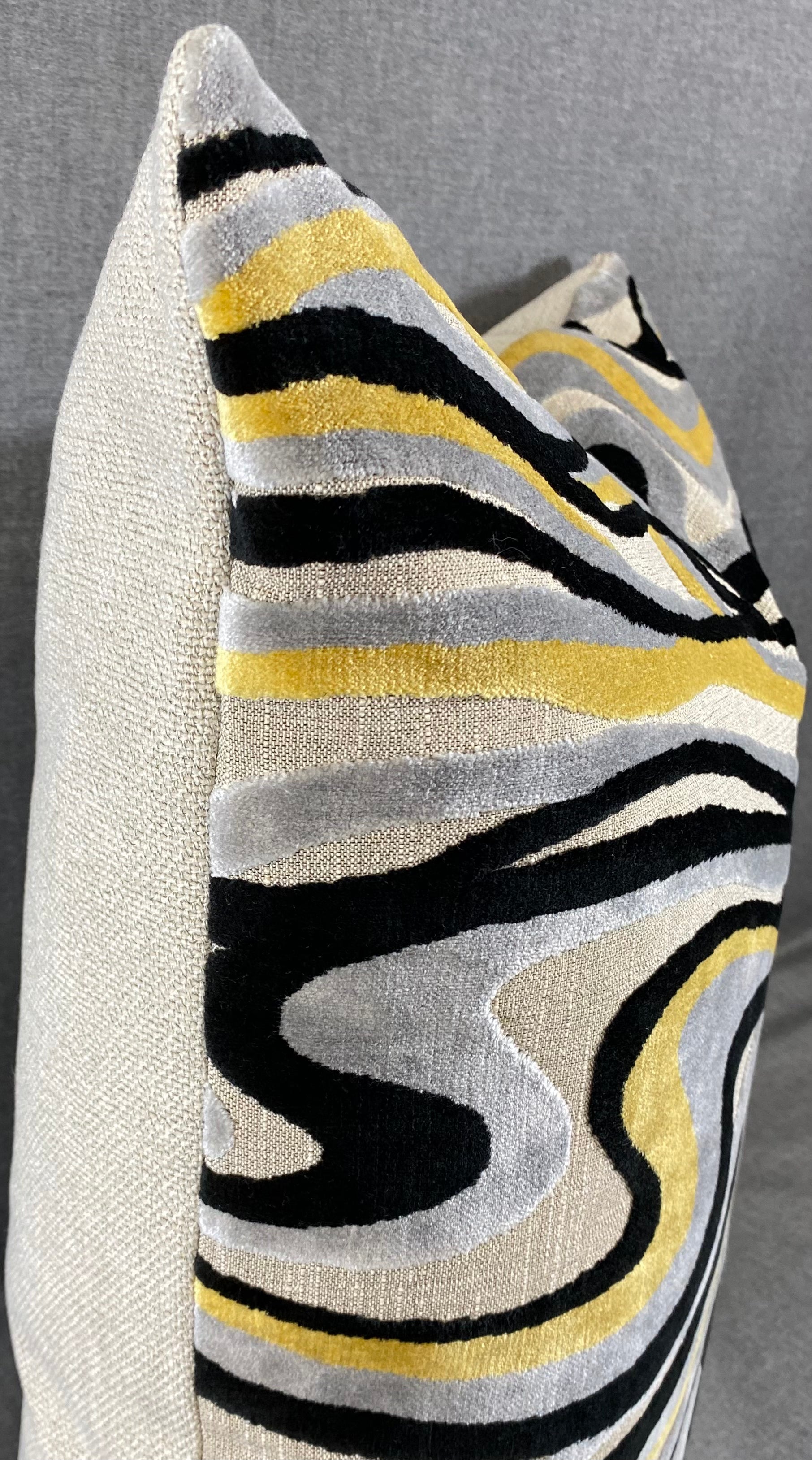 Raised velour swayed lines of golden yellow, black and dark grey on a taupe background.