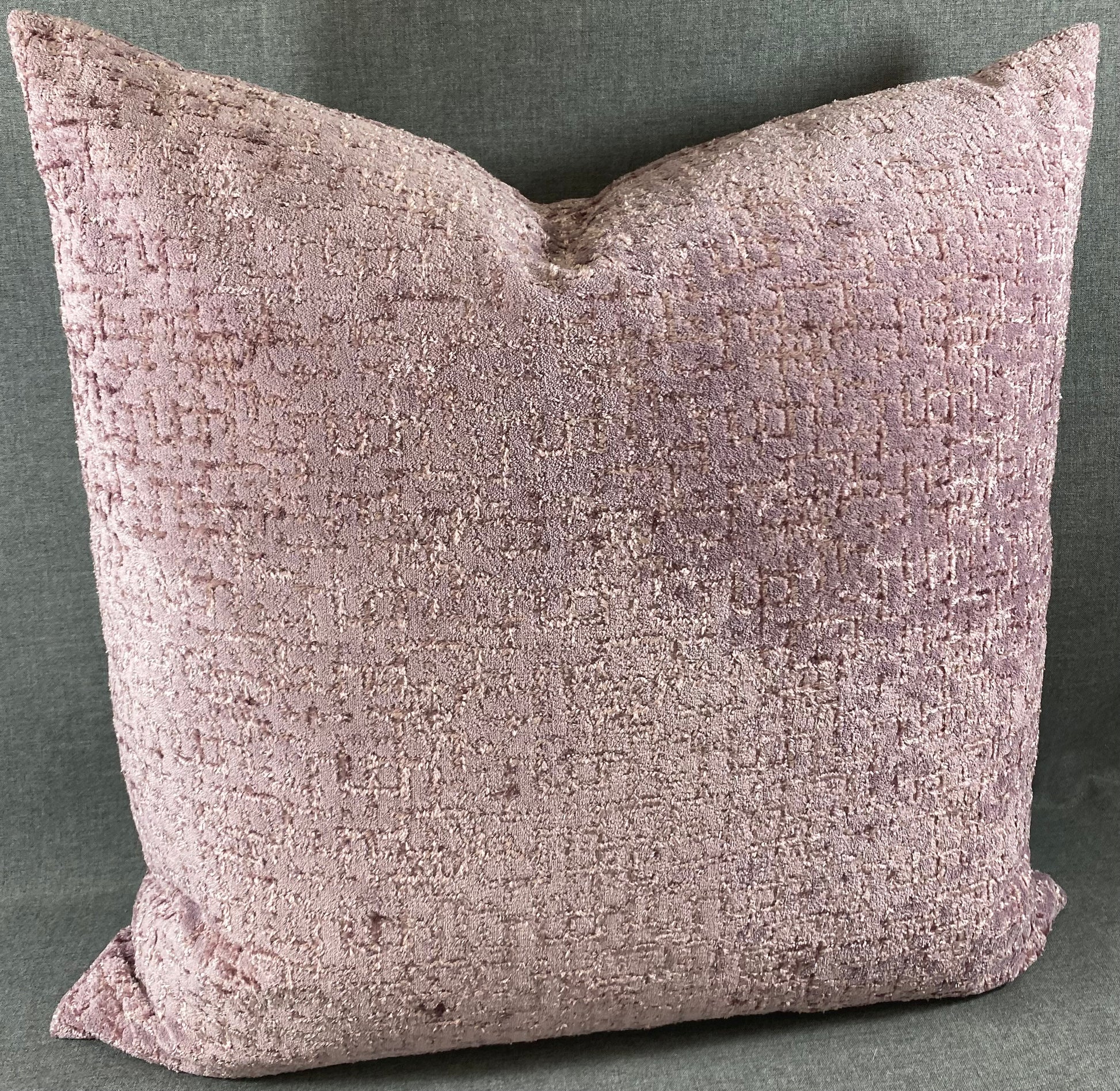 The pillow is 24" x 24 when measured flat with no filling. With filling it is 6" deep. It contains feather and down filling, and is made in America. Deep chenille in beautiful light amethyst.