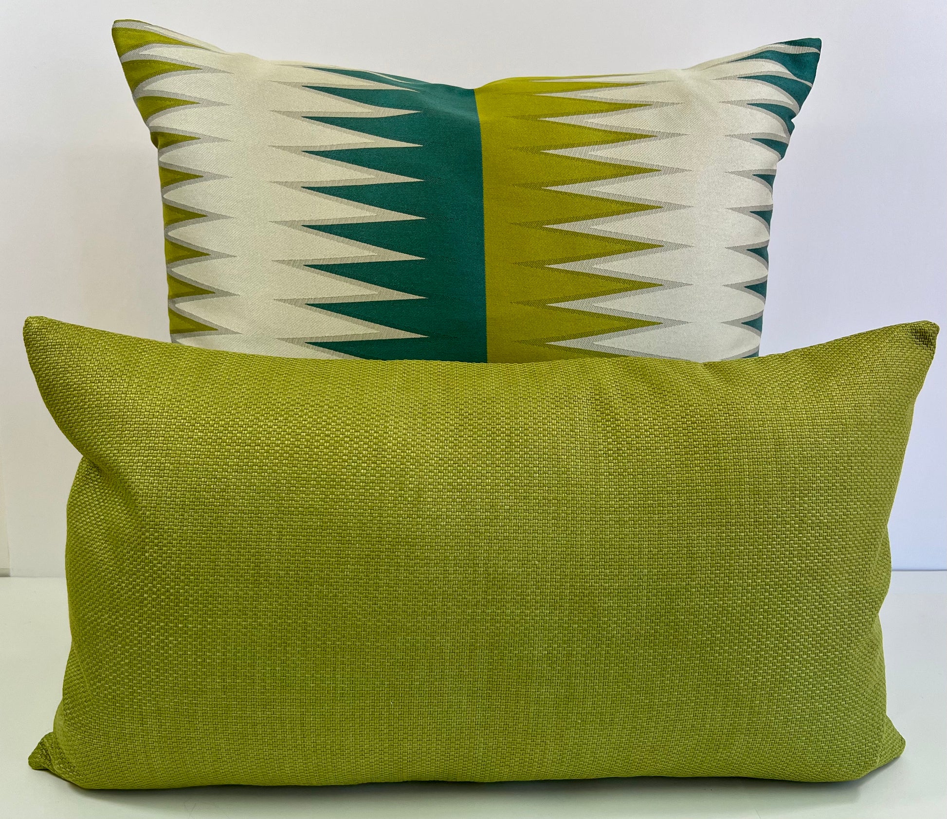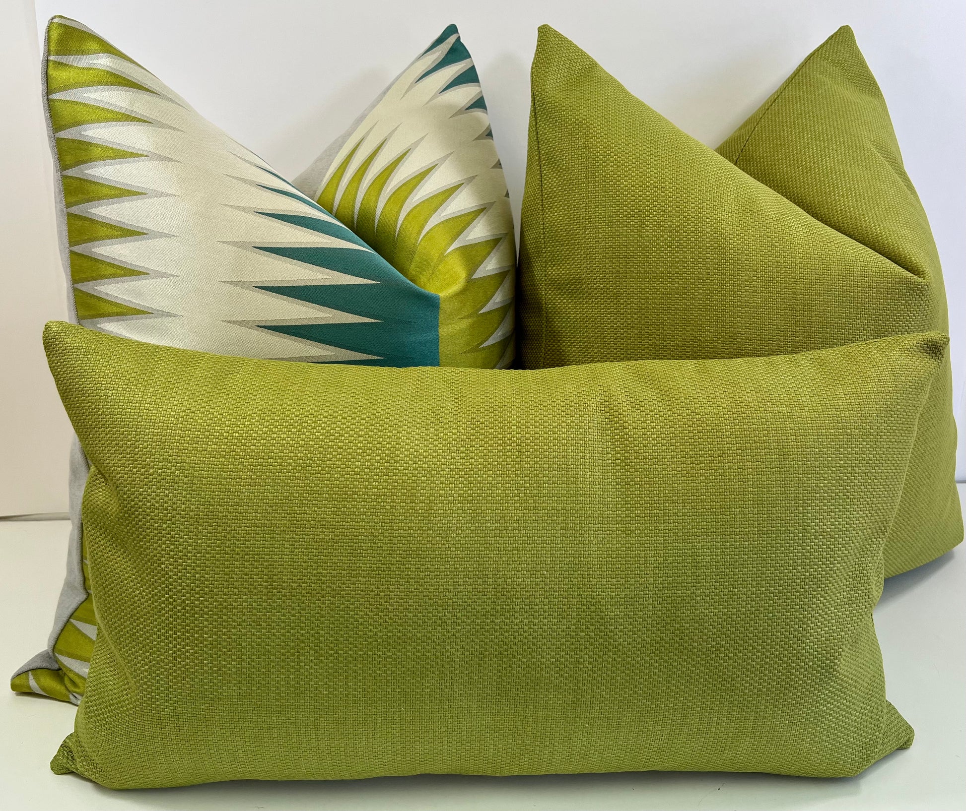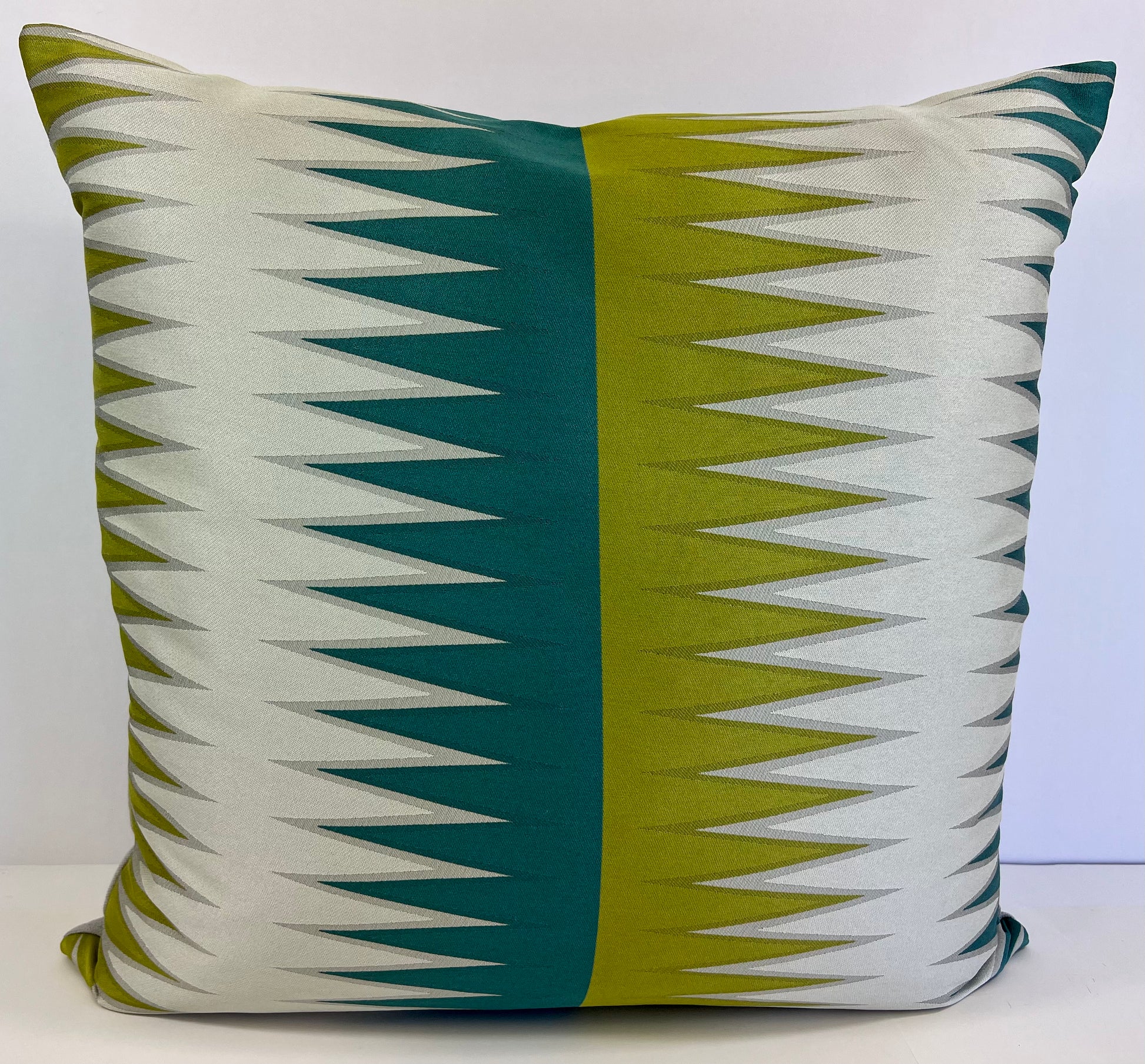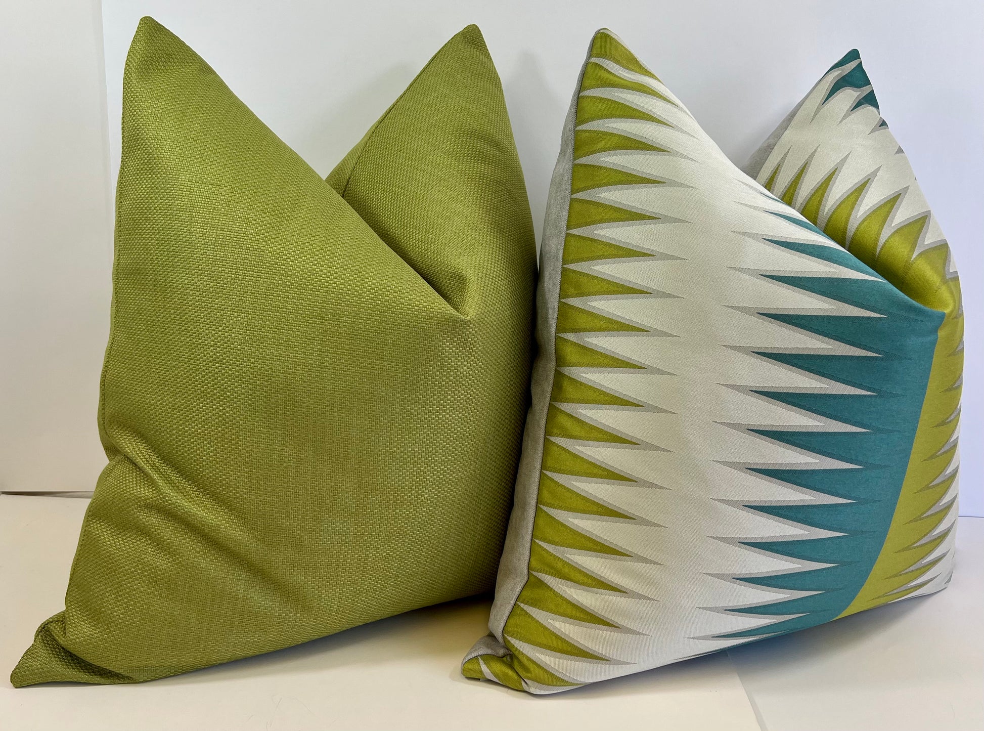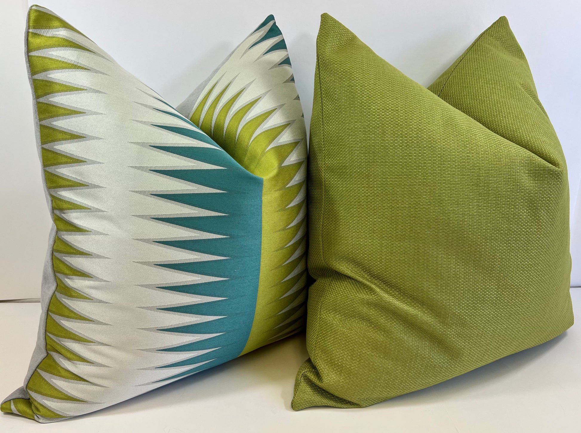 This pillow is 24" x 24" when measured flat with no filling. With filling it is 6" deep. It contains feather and down filling, and is made in America. Lime and Aqua on a cream background.