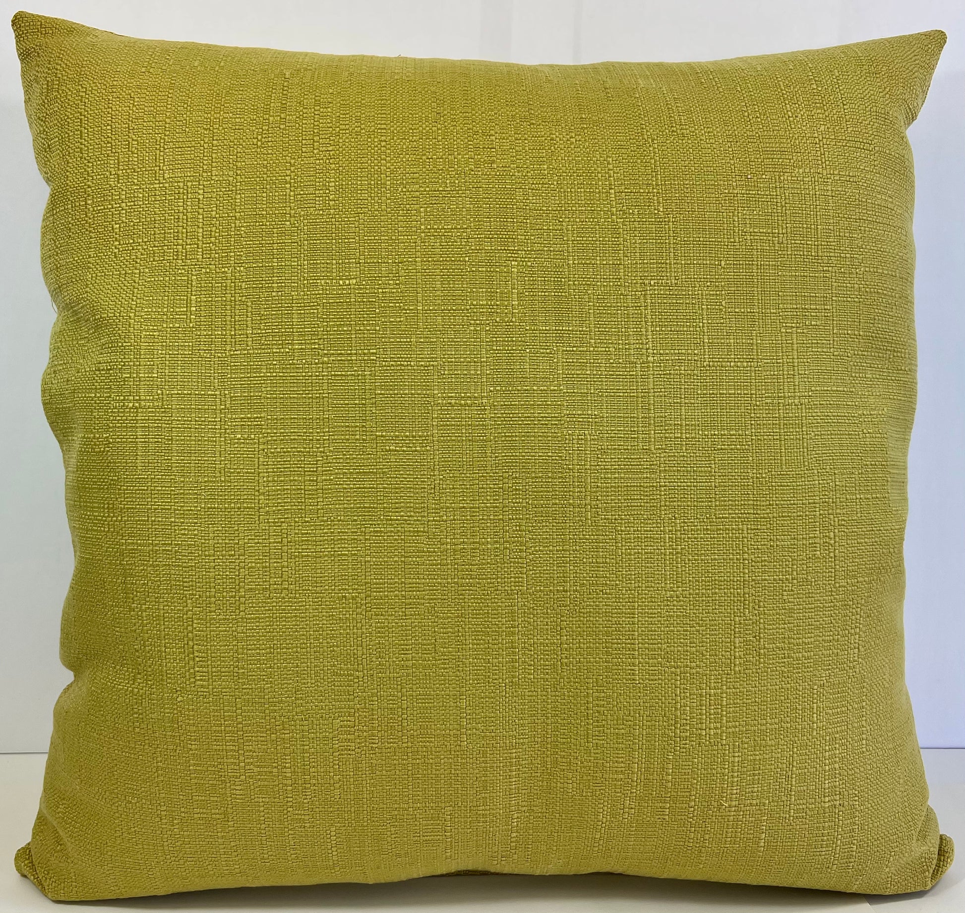 This pillow is 24" x 24" when measured flat with no filling. With filling it is 6" deep. It contains feather and down filling and is made in America. Fresh lime gold green in lovely texture