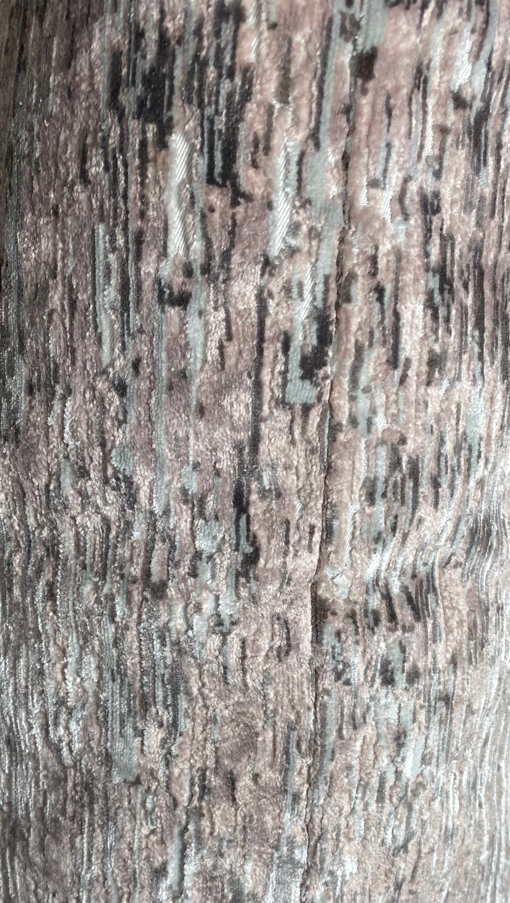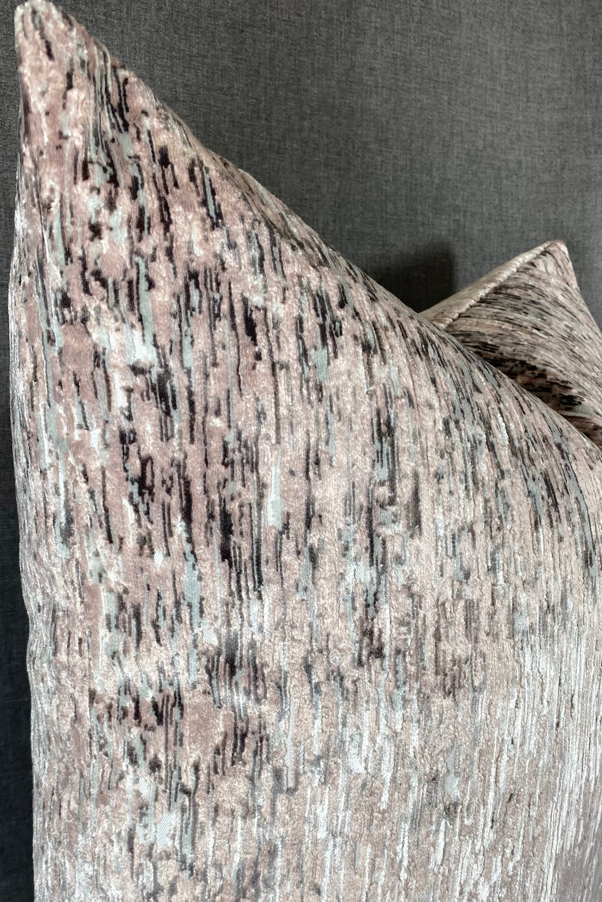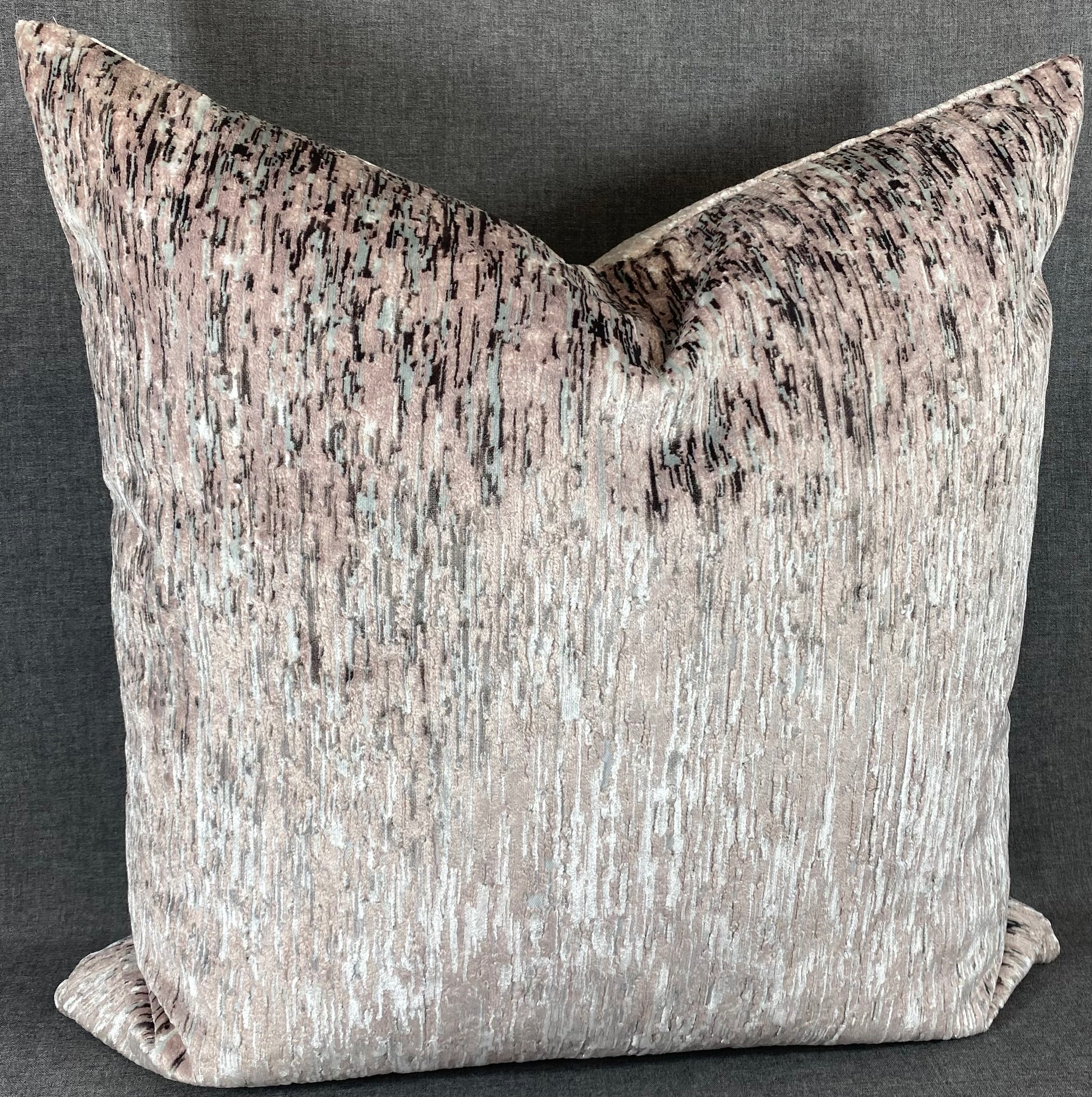 Works well with solids in a variety of pinks and grays. This pillow is 24" x 24" when measured flat with no filling. With filling it is 6" deep. It contains feather and down filling and is made in America. A rain of blush pink and whites run down the pillow front and back.