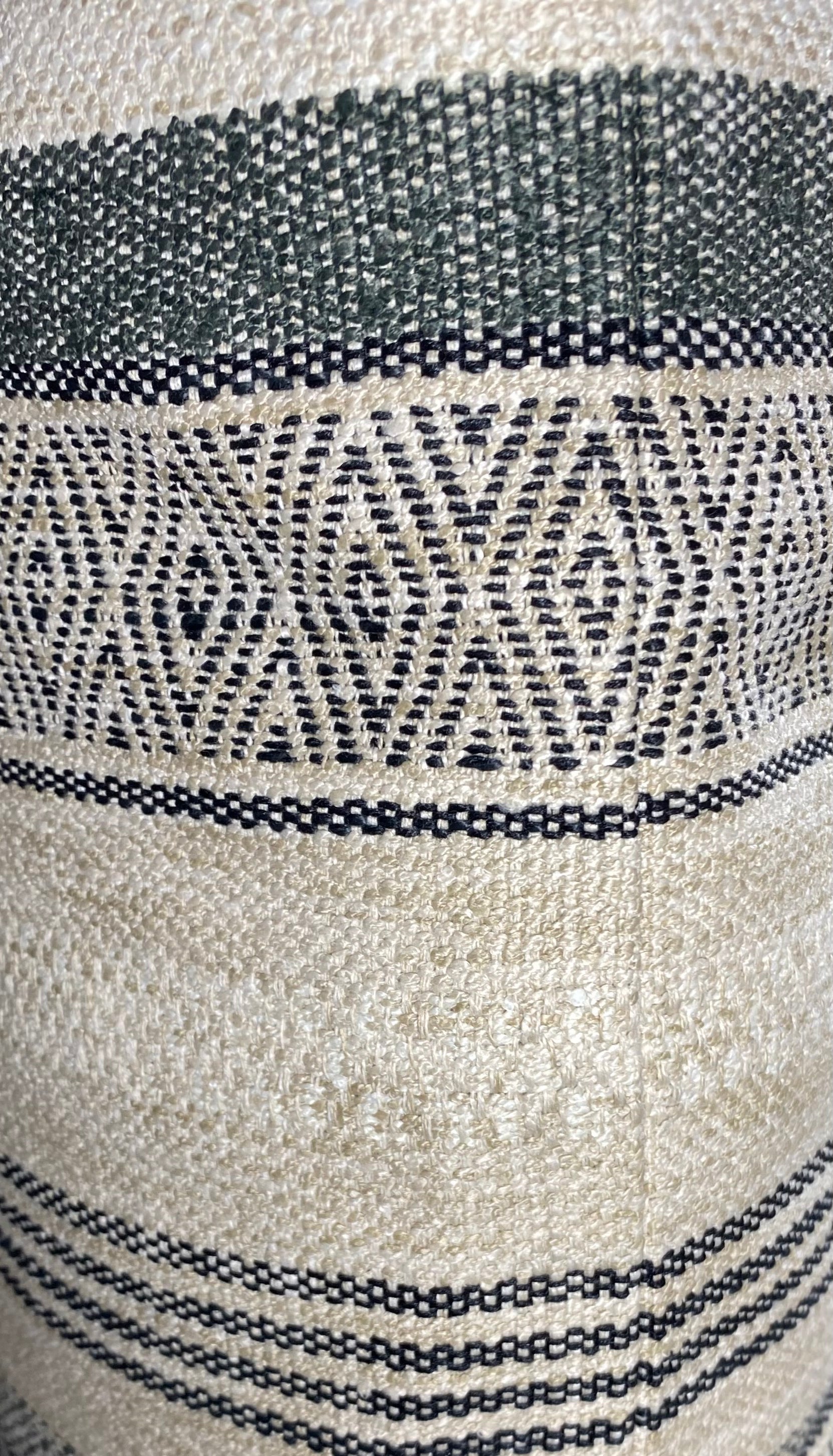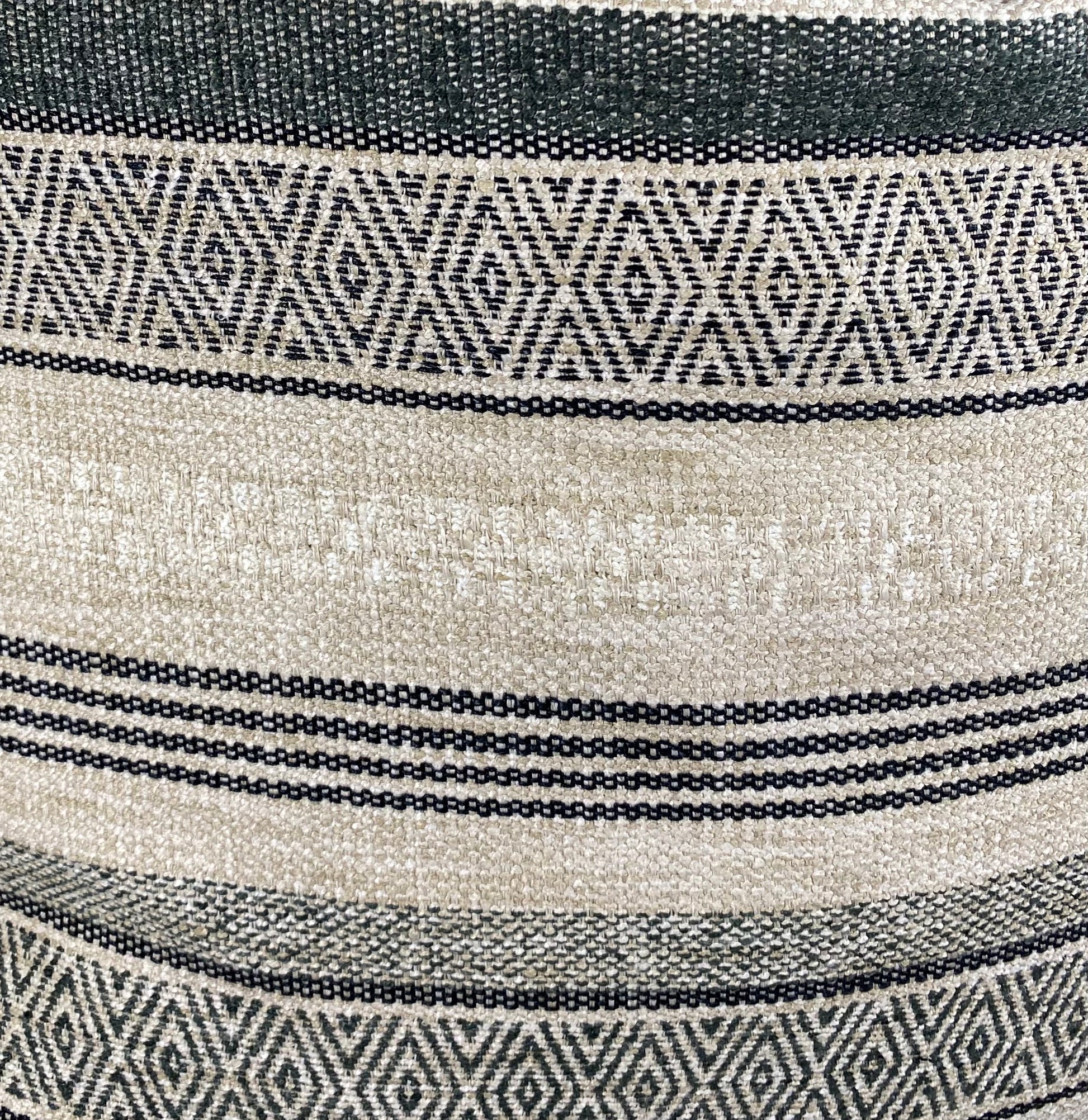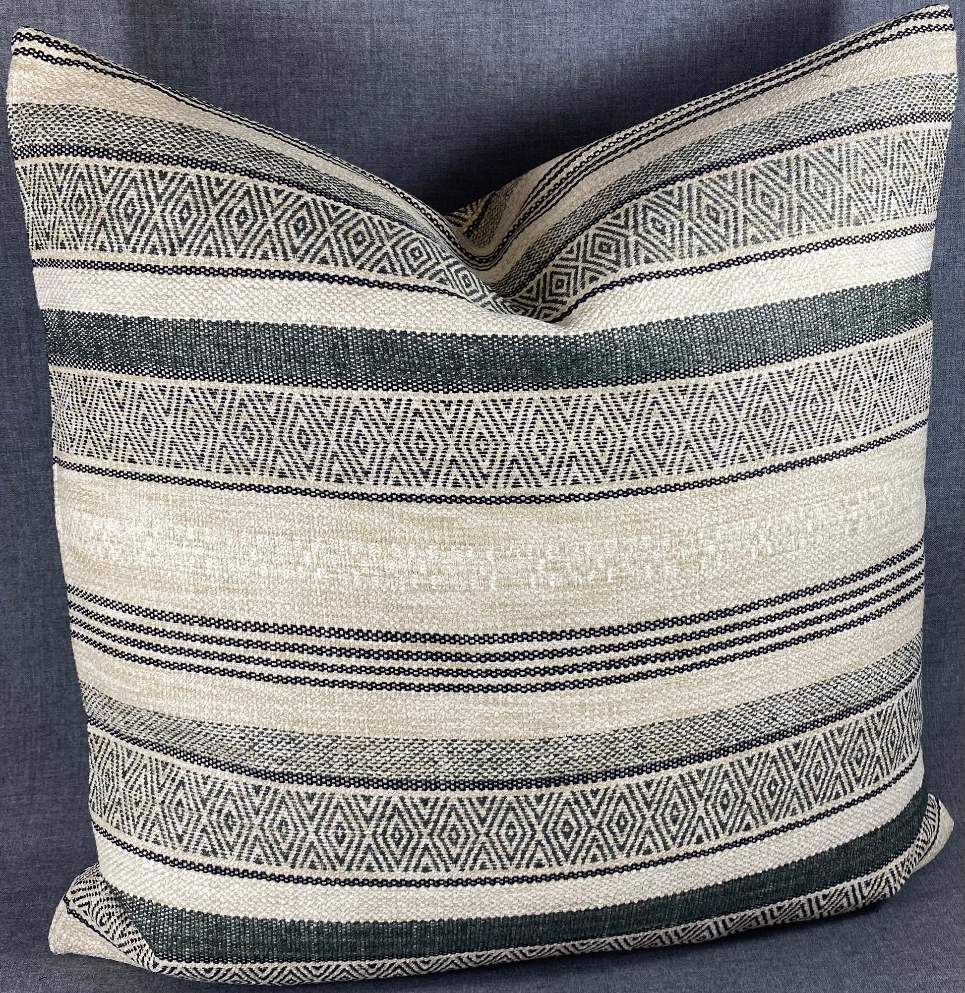 This pillow is 24" x 24" when measured flat with no filling. With filling it is 6" deep. It contains feather and down filling and is made in America. Textural woven striped fabric of patterned greys, blacks, tans and creams. Same fabric on both sides.