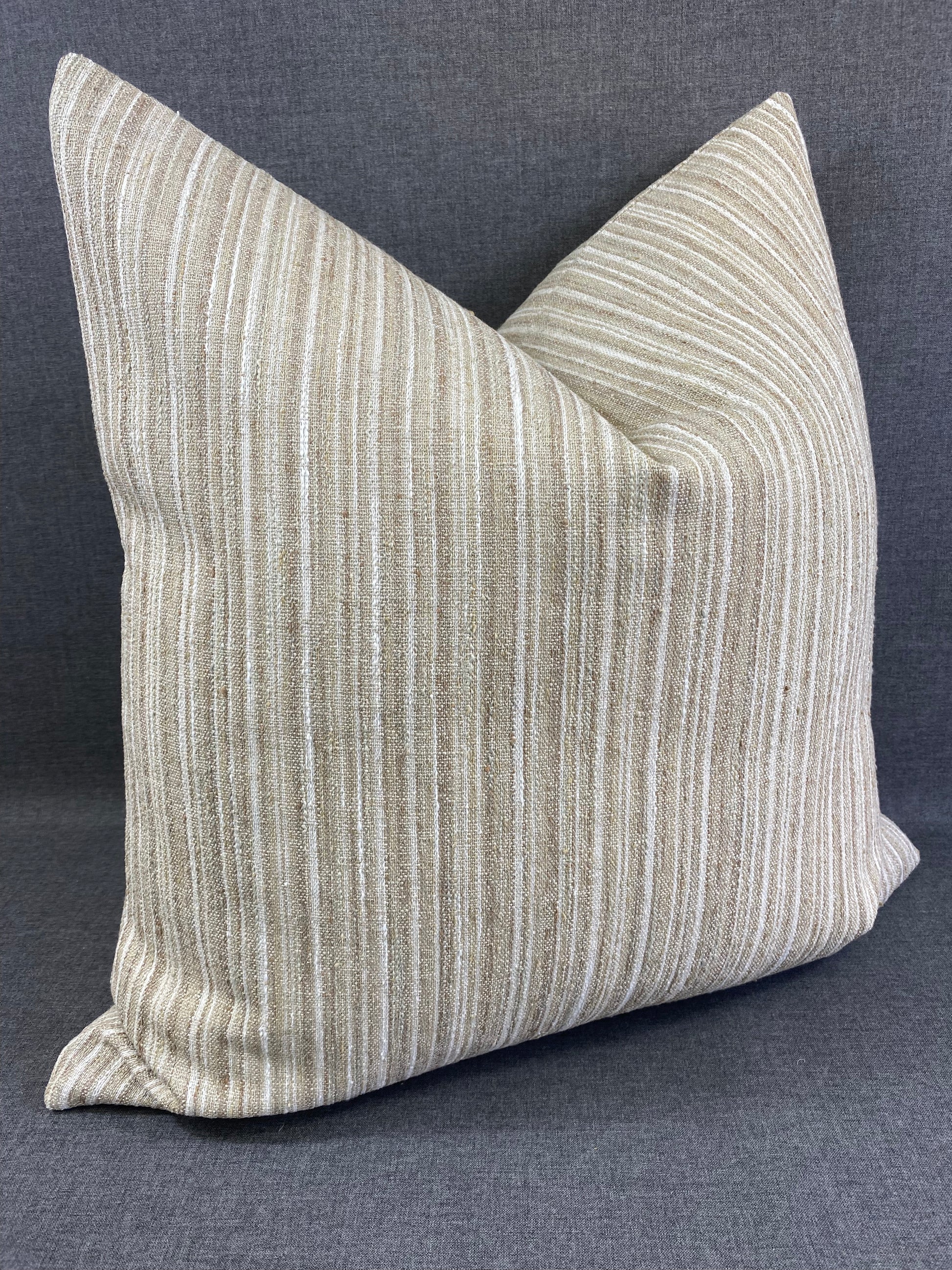 Limited edition. This pillow is 24" x 24" when measured flat with no filling. With filling it is 6" deep. It contains feather and down filling and is made in America. Lovely woven texture of beige, white and cream stripes.