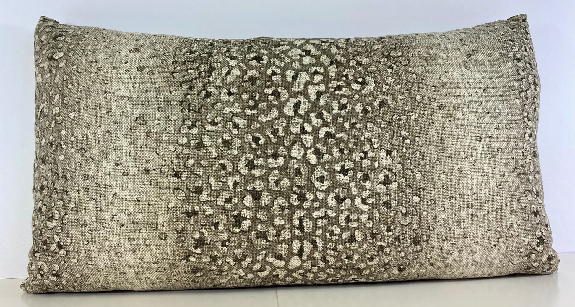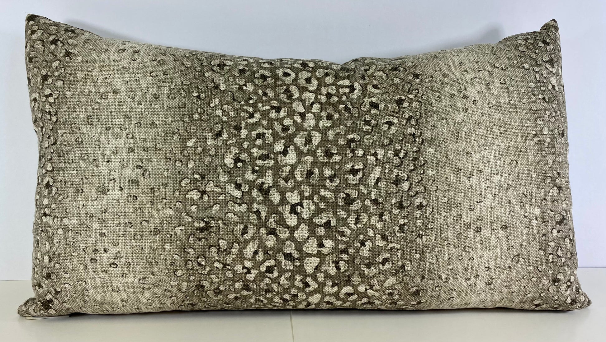 This pillow is 24" x 14" when measured flat with no filling. With filling it is 6" deep. It contains feather and down filling and is made in America. Animal style print in grey brown