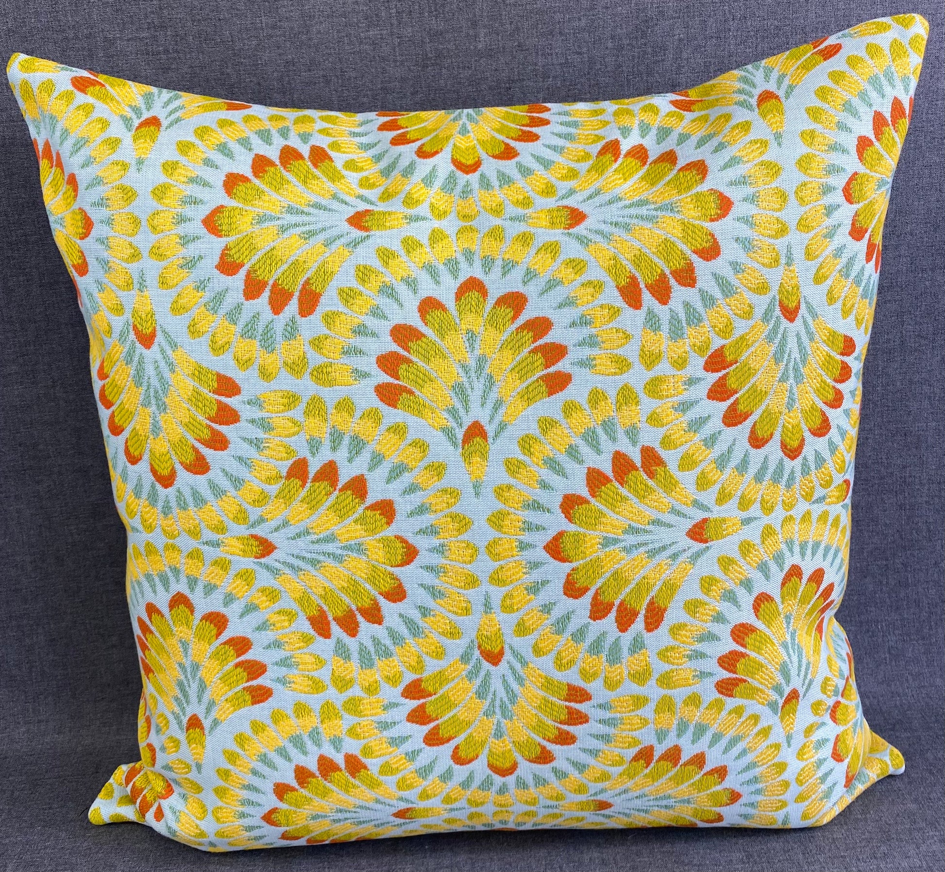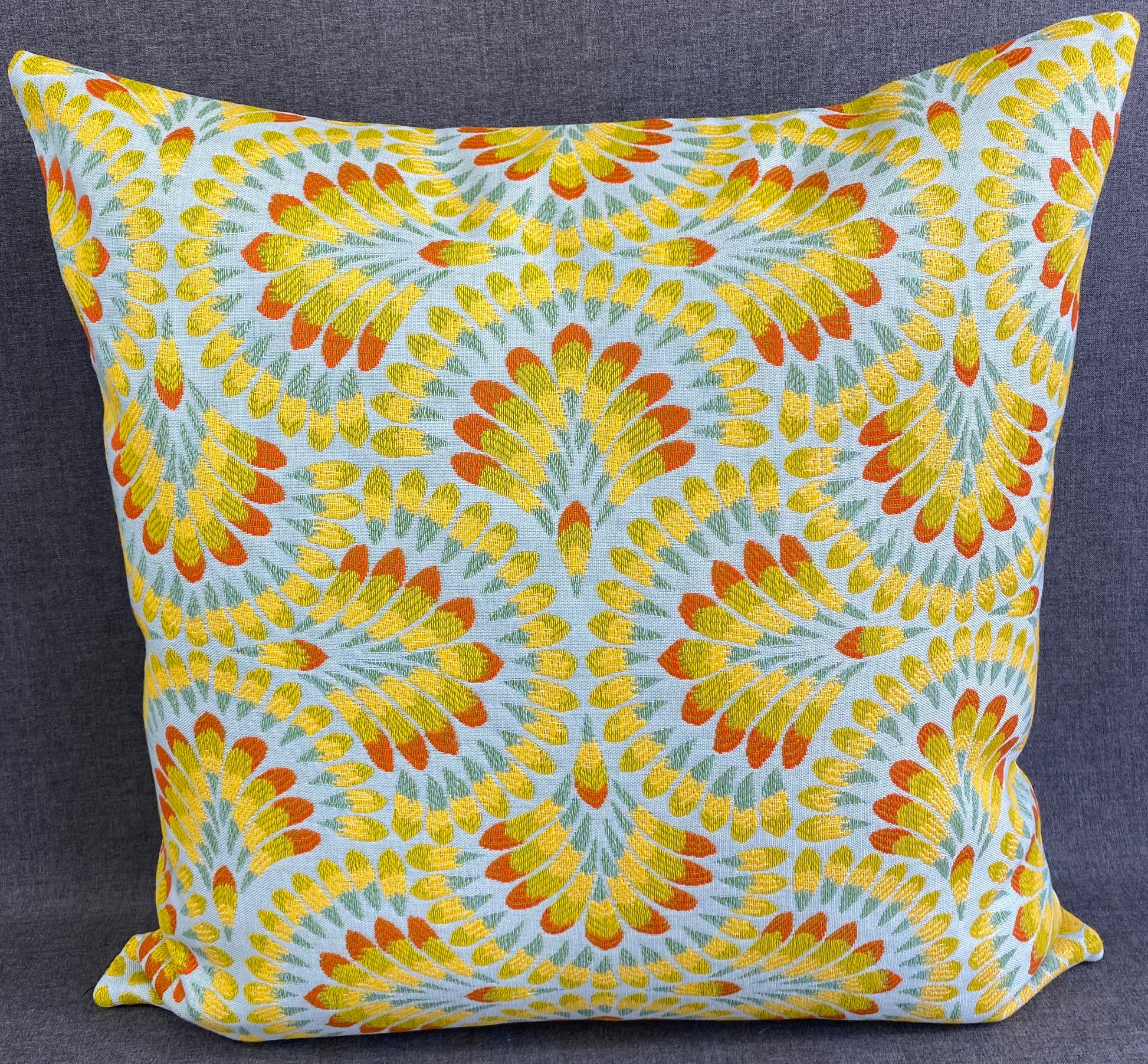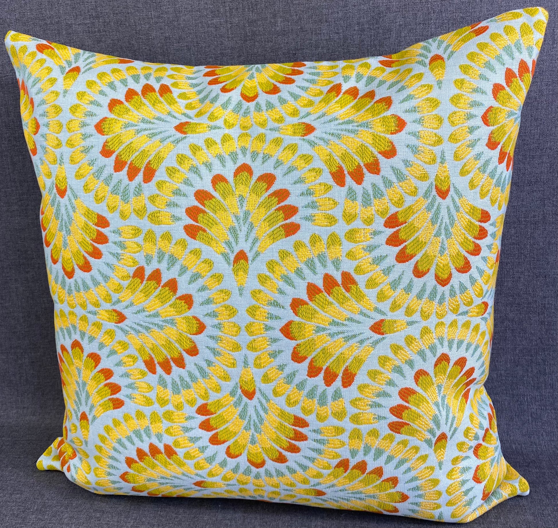 This pillow is 22" x 22" when measured flat with no filling. With filling it is about 5” deep. It contains fiber filling and is made in America.