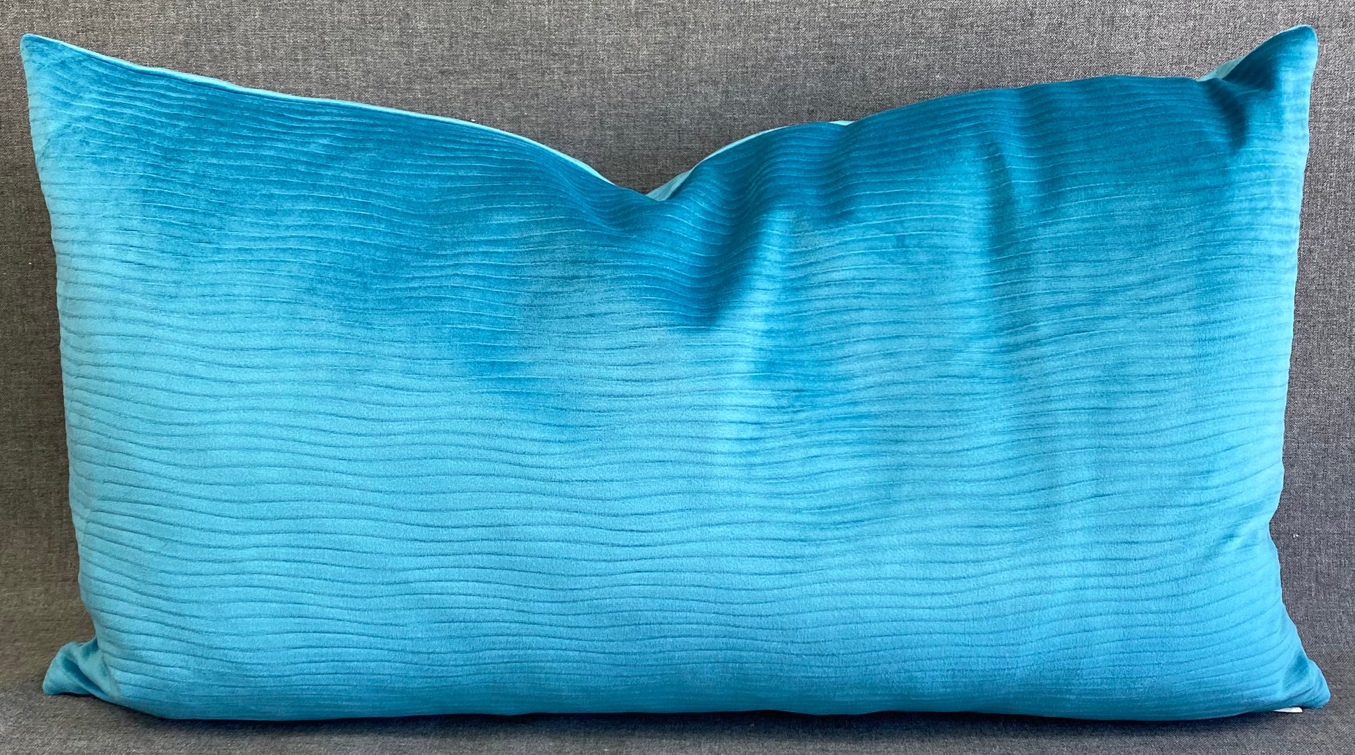 This pillow is 24" x 14" when measured flat with no filling. With filling it is 6" deep. It contains feather and down filling and is made in America. Bright peacock solid with a wavy pattern in the soft fabric.