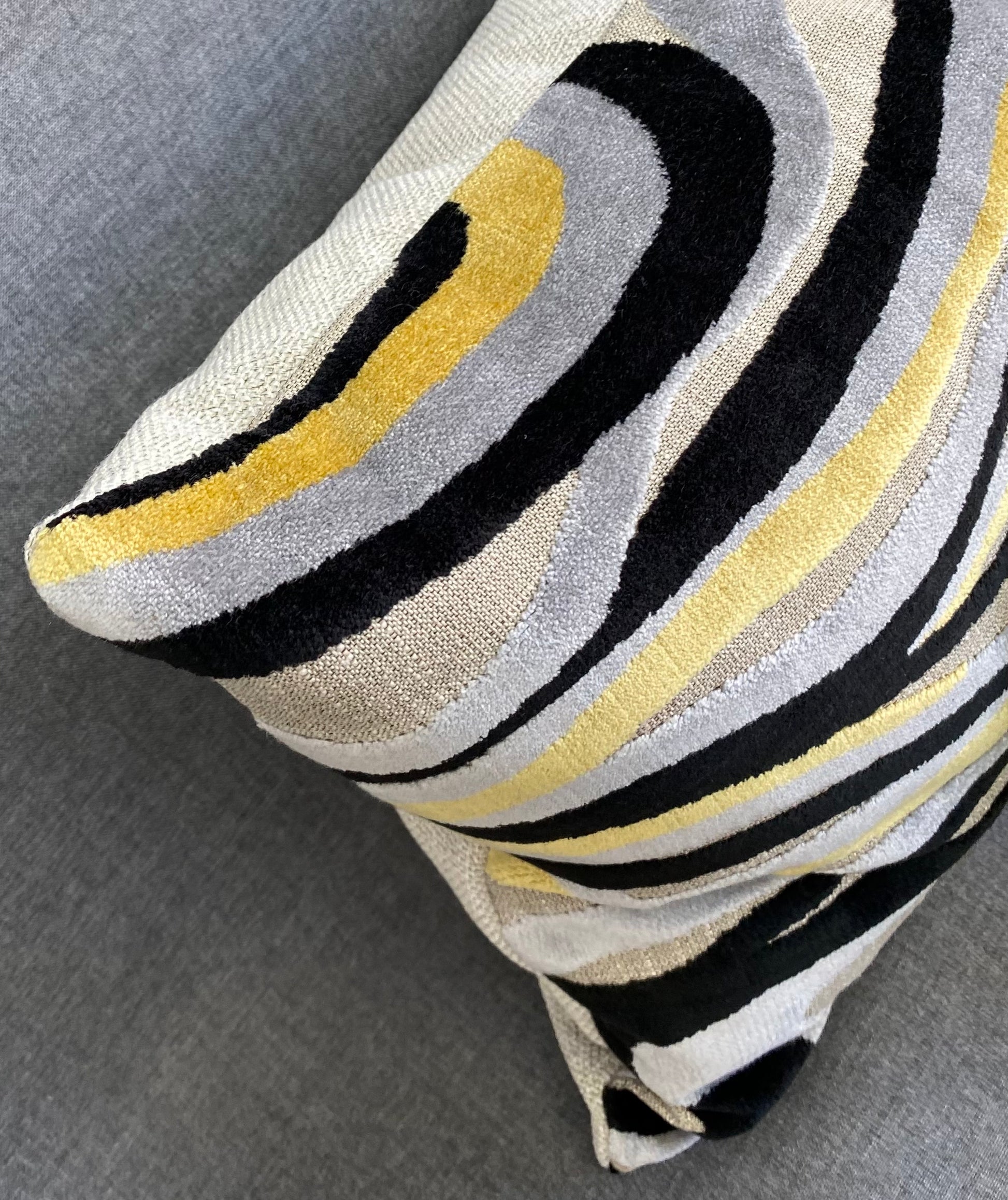 It really is as lovely as it looks. Perhaps even better than the picture as the texture comes to life in your hand. This pillow is 24" x 24" when measured flat with no filling. With filling it is 6" deep. It contains feather and down filling and is made in America.