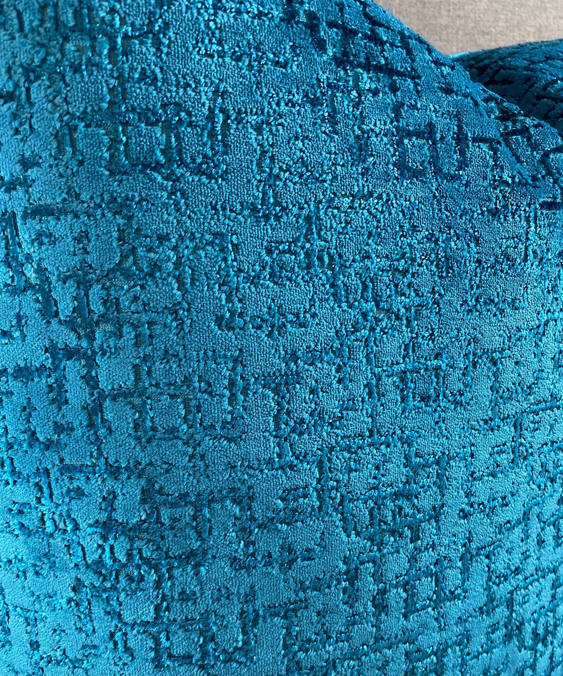 This pillow is 24" x 24" when measured flat with no filling. With filling it is 6" deep. It contains feather and down filling and is made in America. Deep chenille in dark emerald with black hashing.