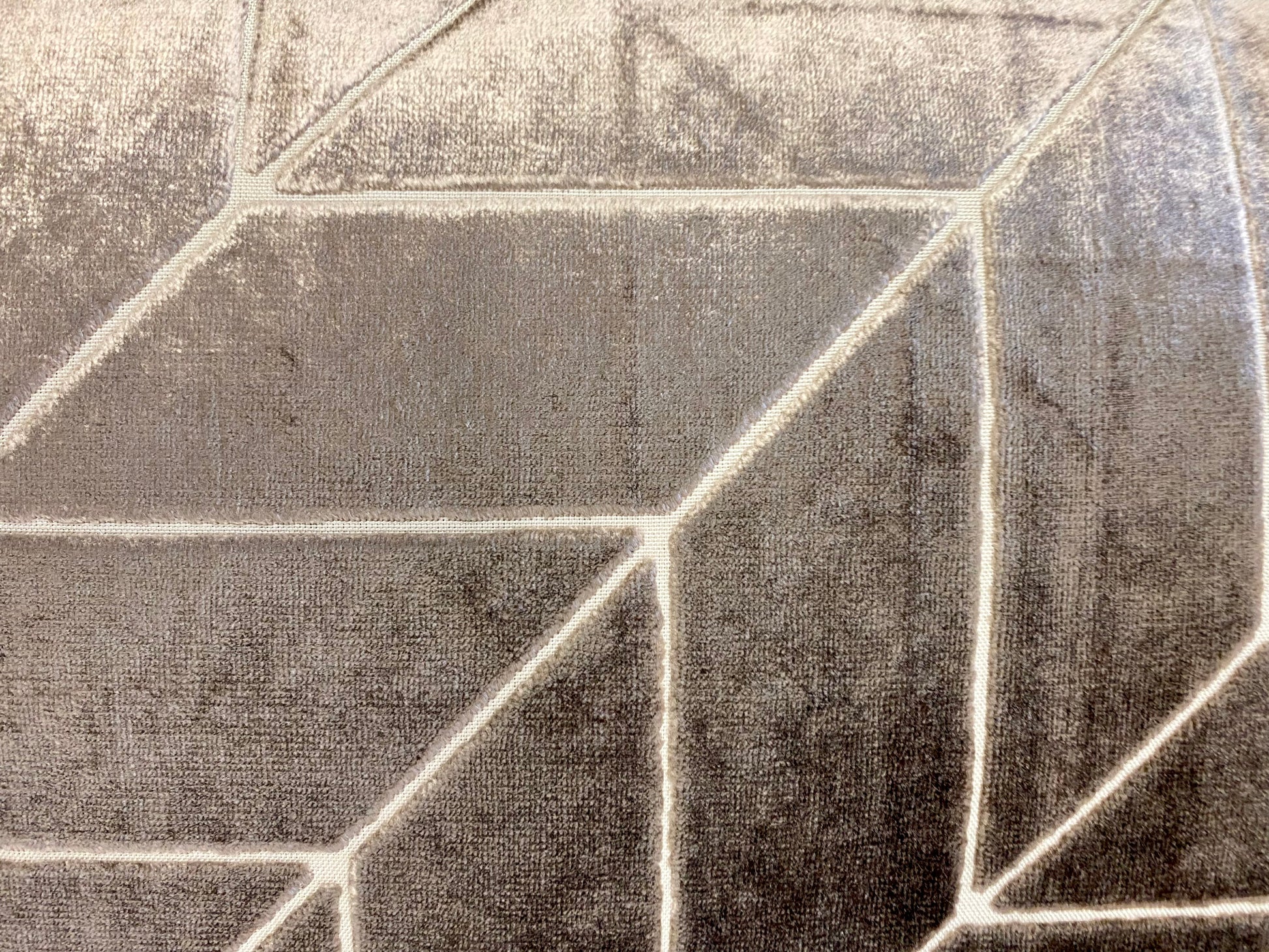 This pillow is 24" x 14" when measured flat with no filling. With filling it is 6" deep. It contains feather and down filling and is made in America. Strong geometrical design carved into shimmering mocha velvet.