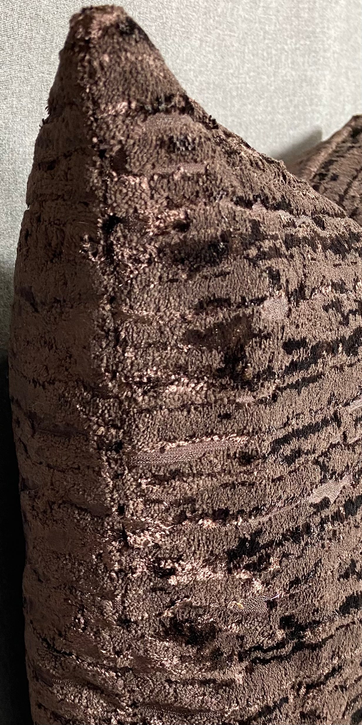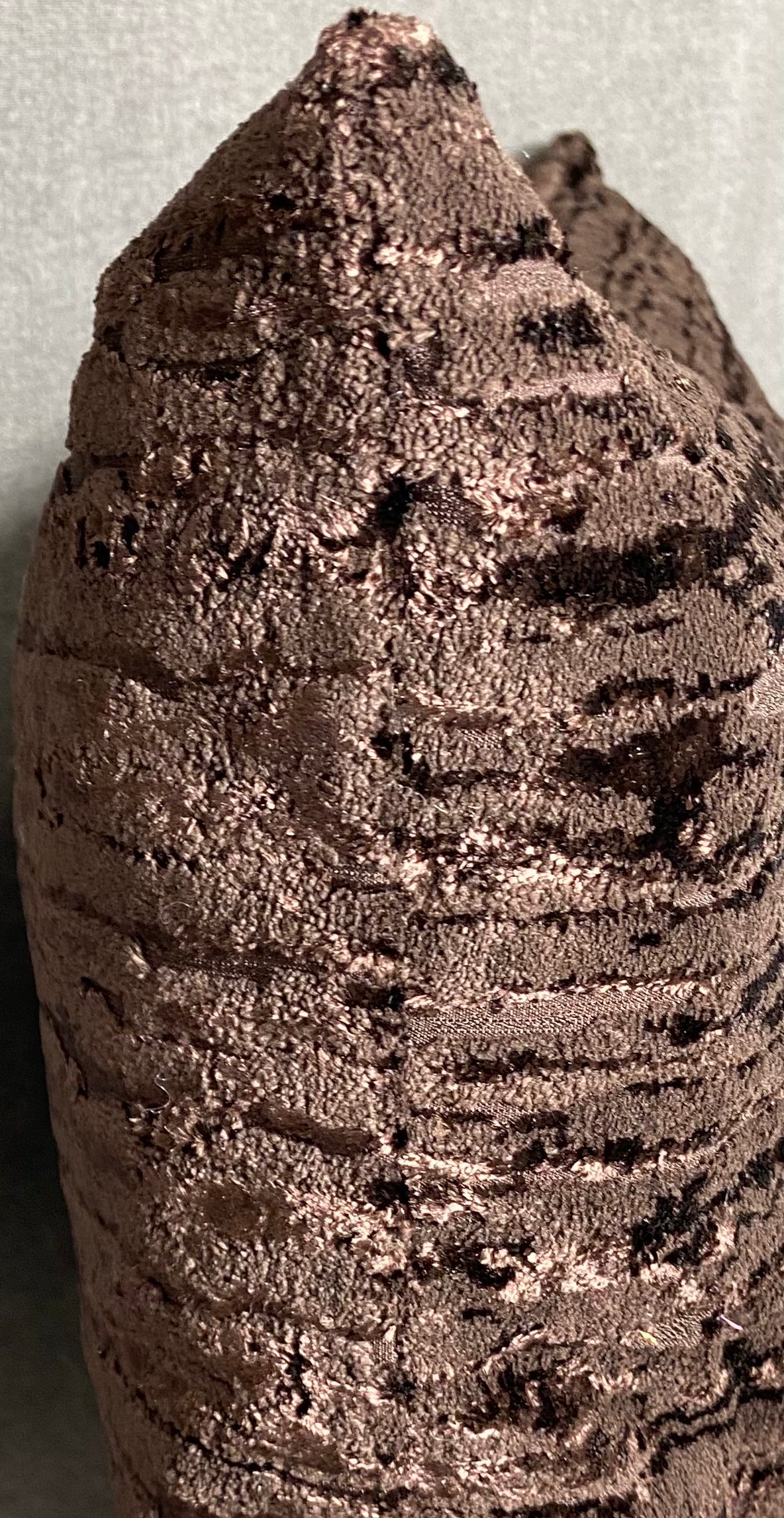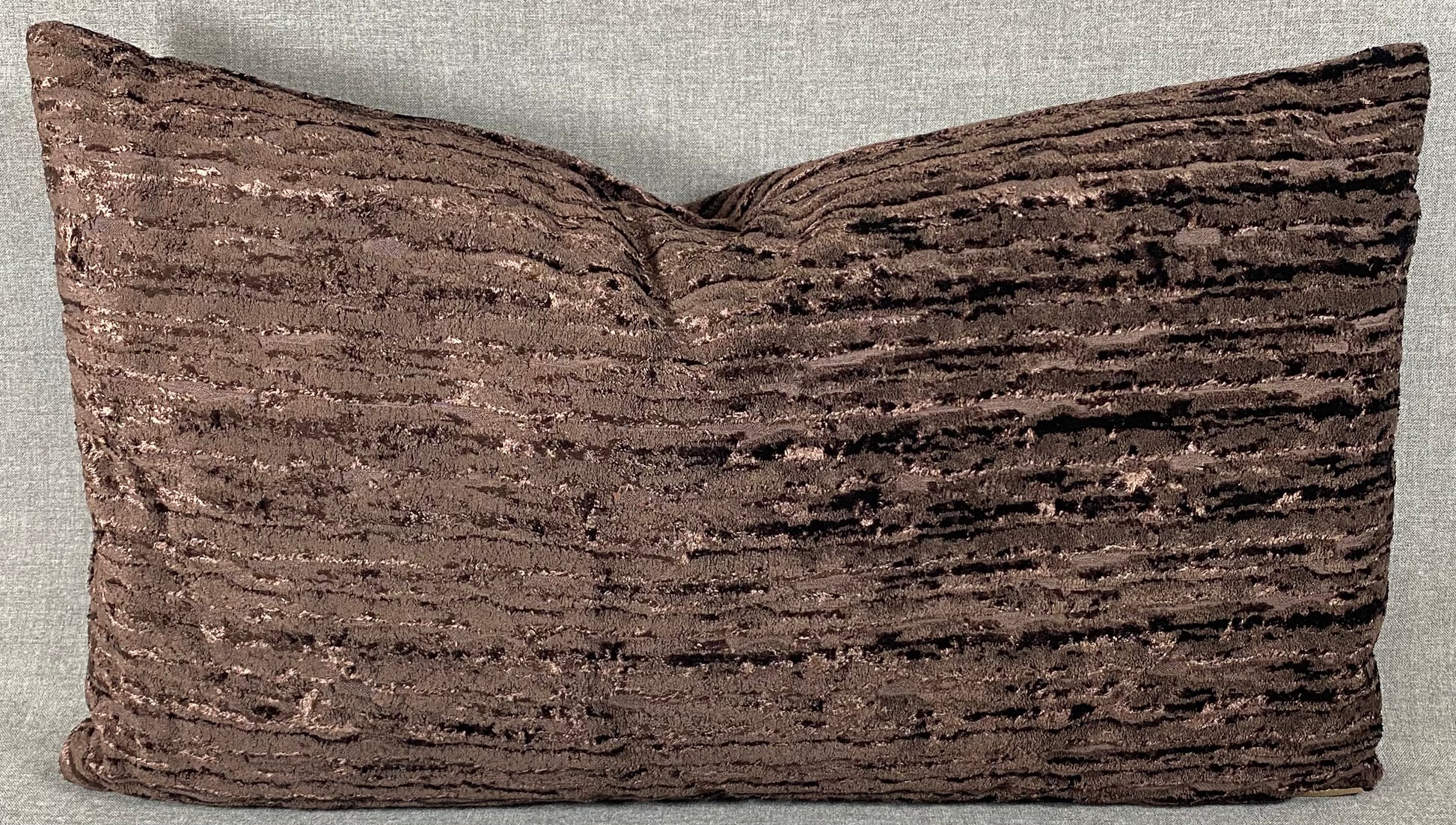 This pillow is 24" x 14" when measured flat with no filling. With filling it is 6" deep. It contains feather and down filling and is made in America. These are limited production runs until the fabric is gone. Luscious textural fabric of dark brown fabric with a plum tone.
