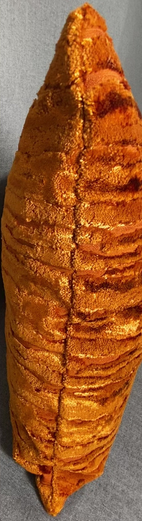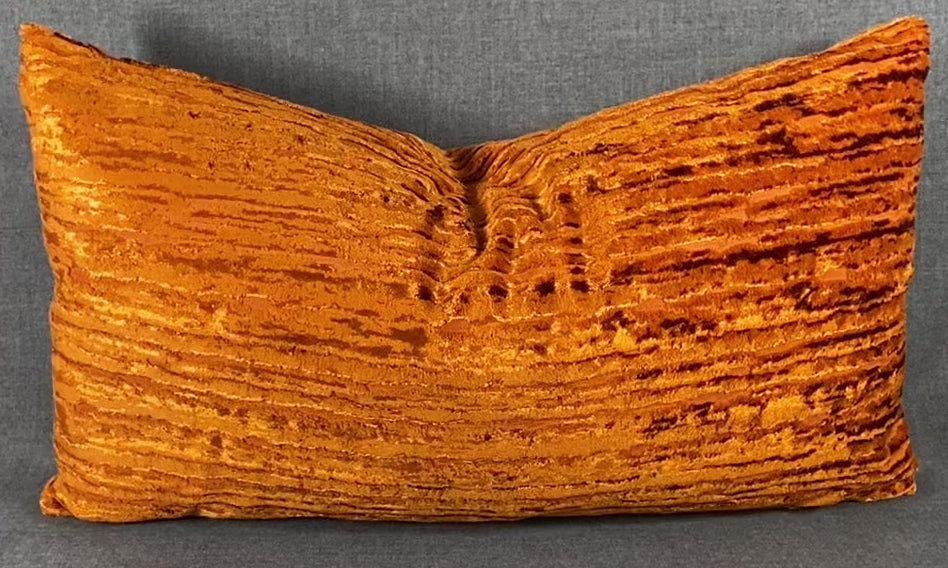 The front features a plush, textured fabric with organic horizontal striations that create natural movement and visual dimension. The surface subtly shifts with the light, revealing tonal variations within the burnt orange palette that elevate the pillow’s artisanal presence.