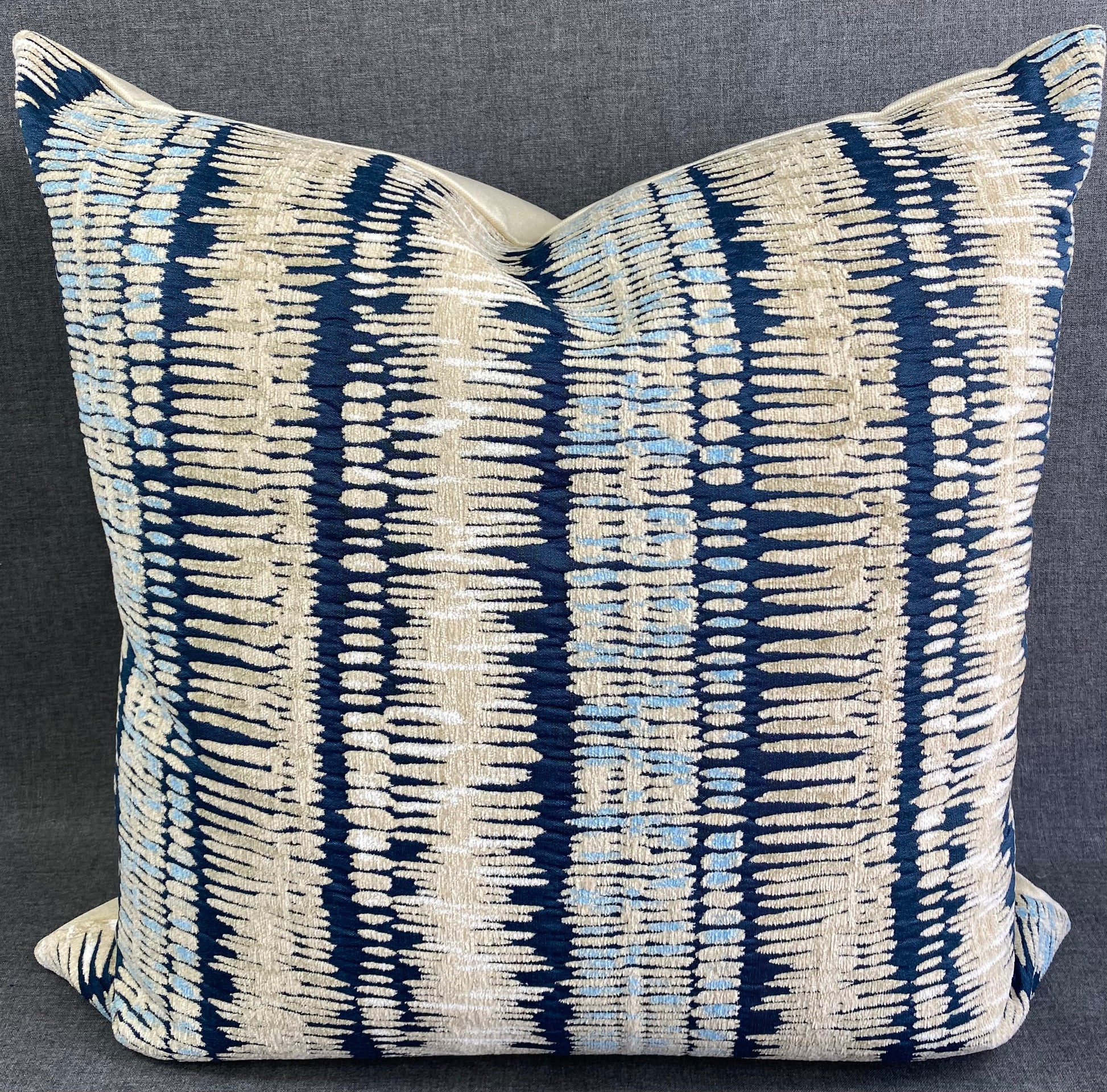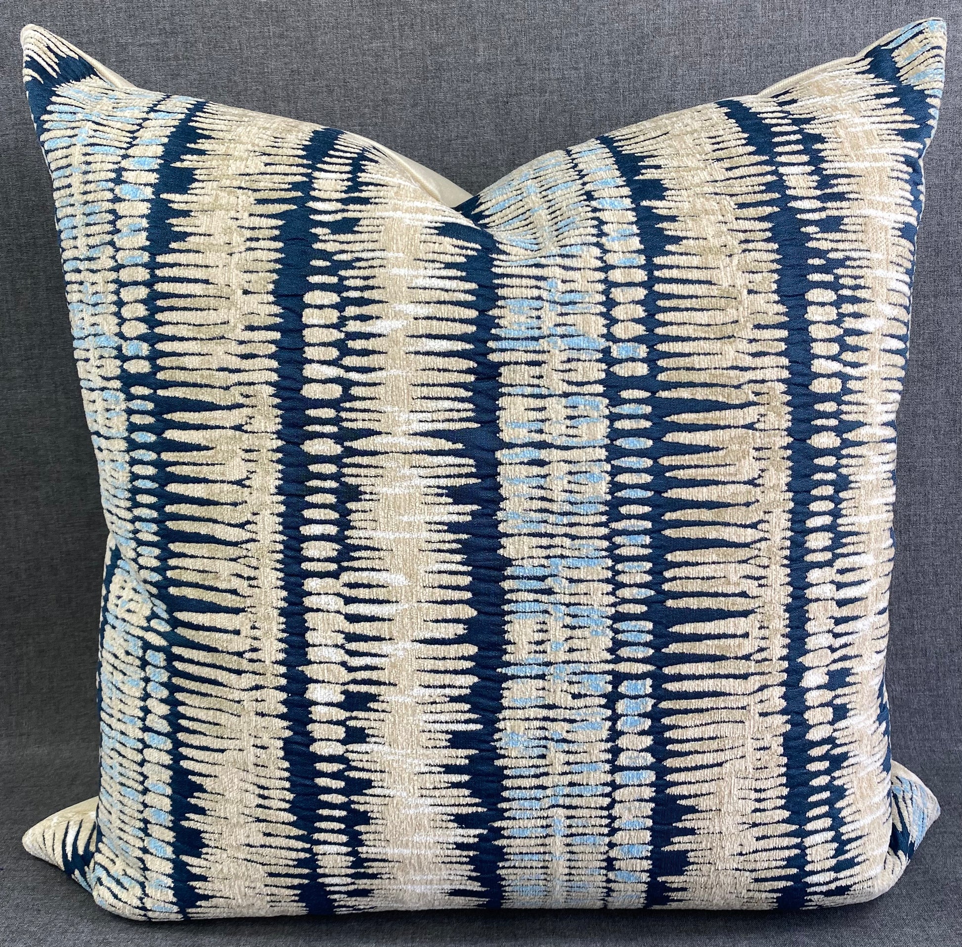This pillow is 24" x 24" when measured flat with no filling. With filling it is 6" deep. It contains feather and down filling and is made in America. Chenille stripes of taupe, sky and cream on a navy background.